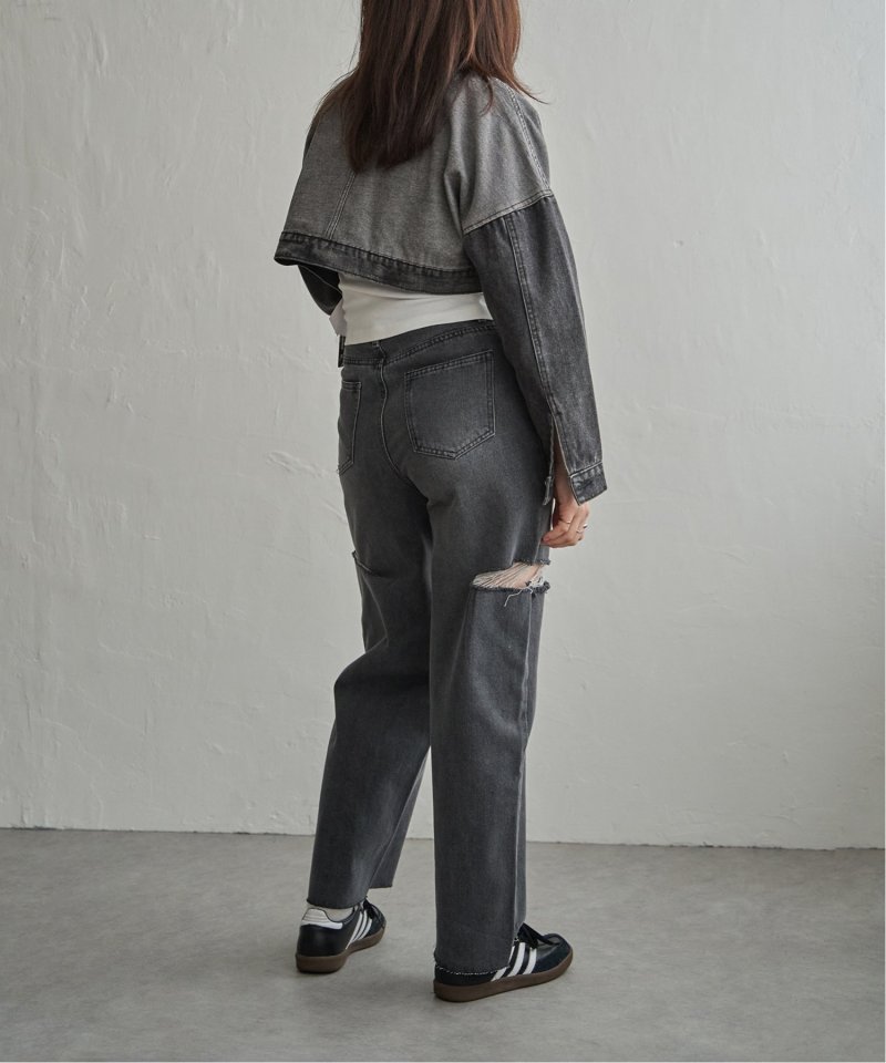 デニムの濃淡を活かした大胆な切り替えデザインで、視線を引き寄せます。