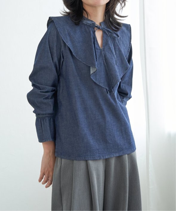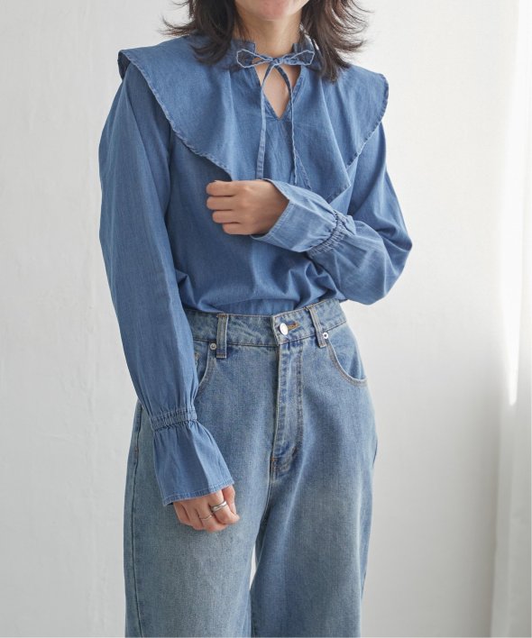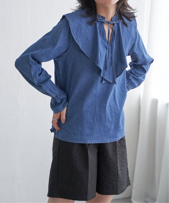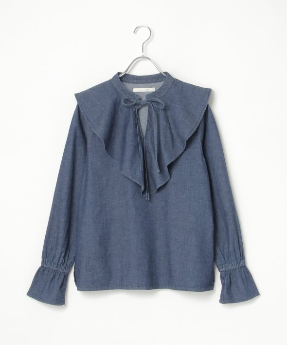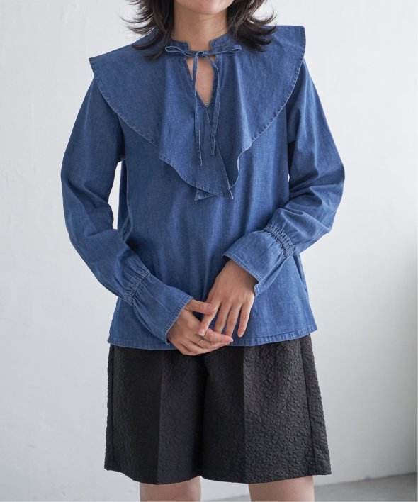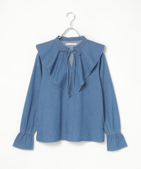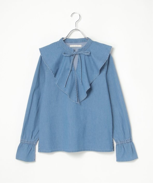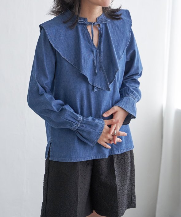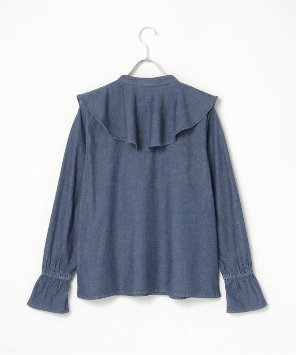 ひらひらと波打つ、華やかなラッフルカラーのデニムシャツ。
