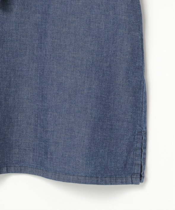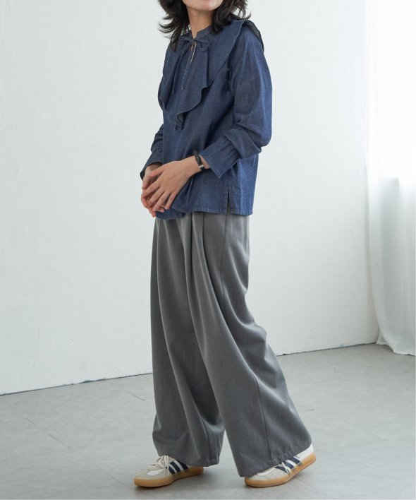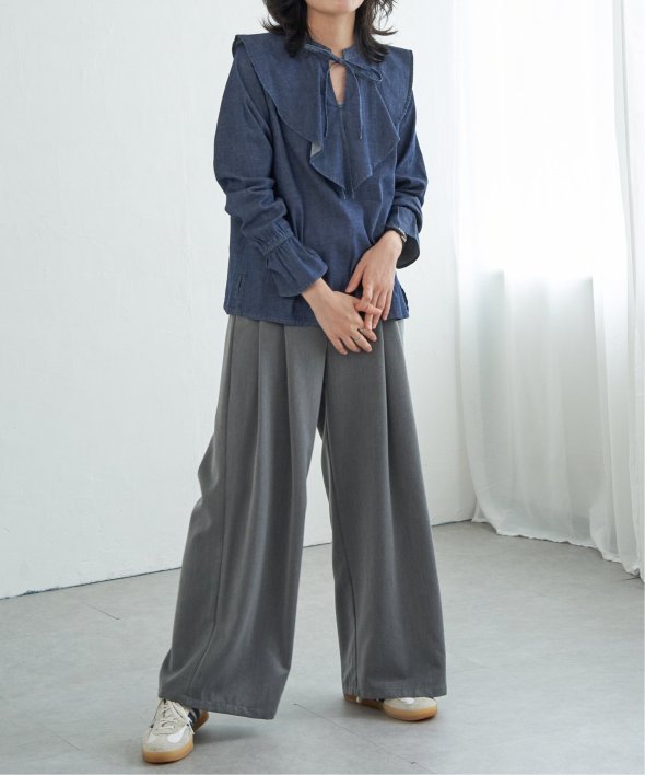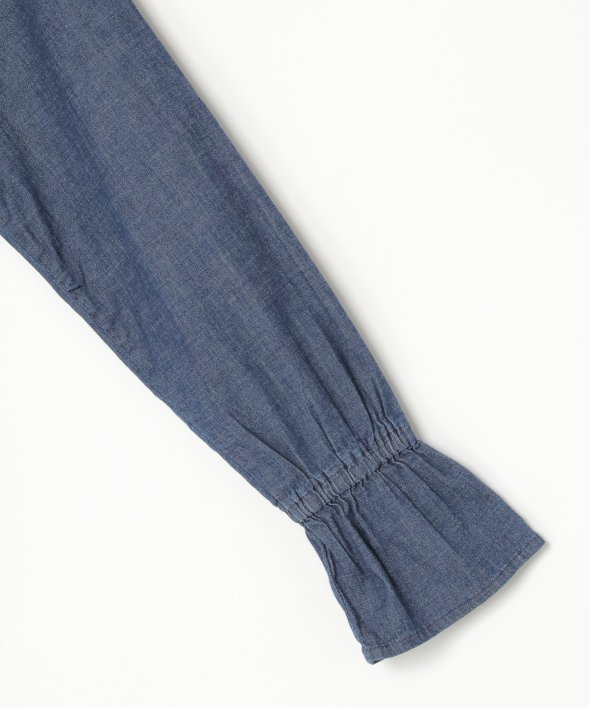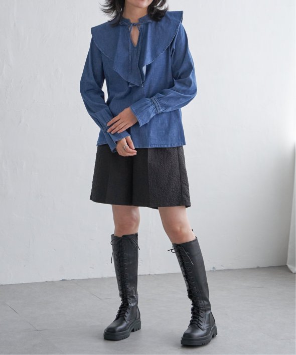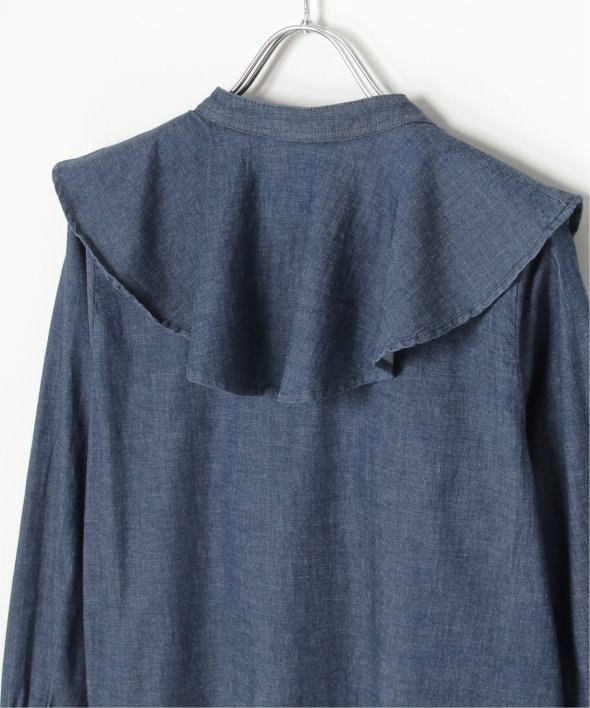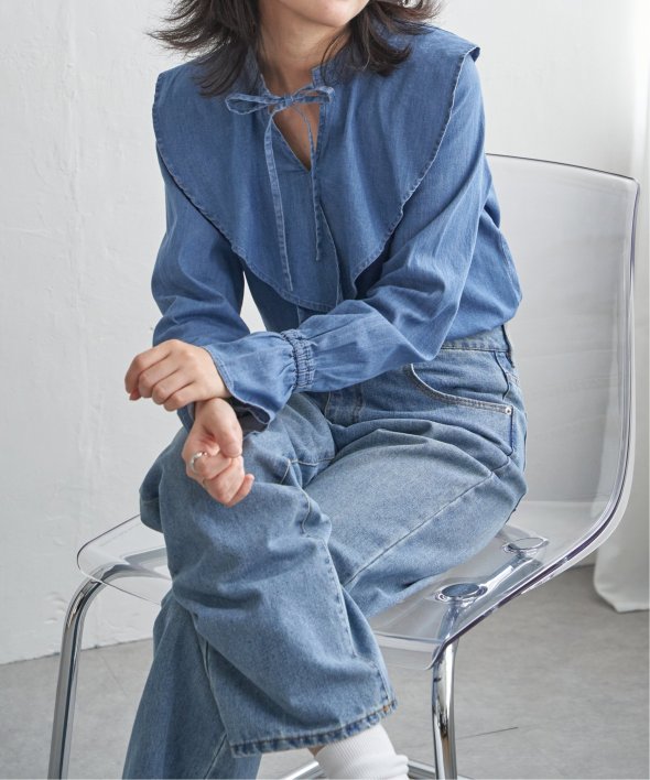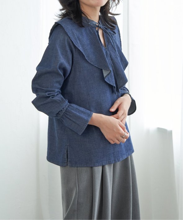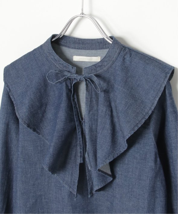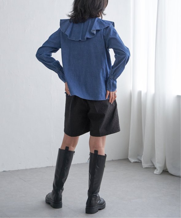 ひらひらと波打つ、華やかなラッフルカラーのデニムシャツ。