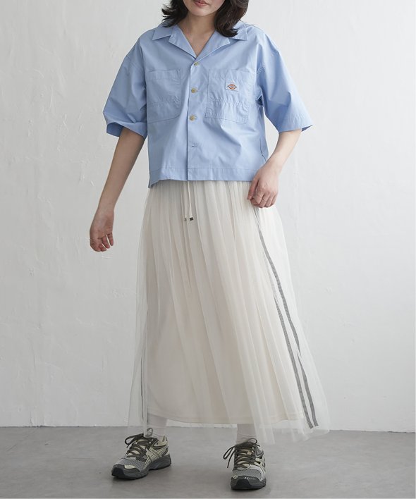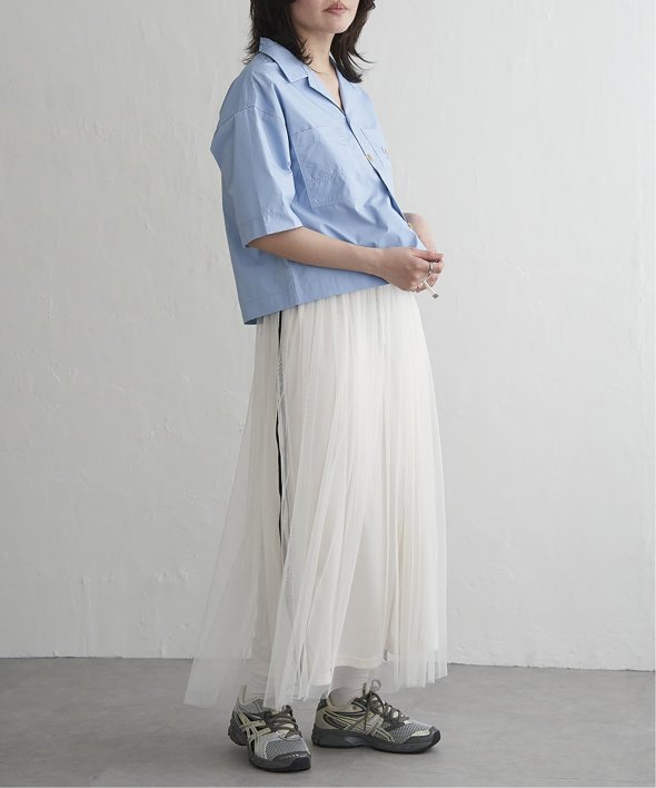 ショート丈のため、ワイドパンツやフレアスカートなどボリューム系ボトムと合わせるのもおすすめです。