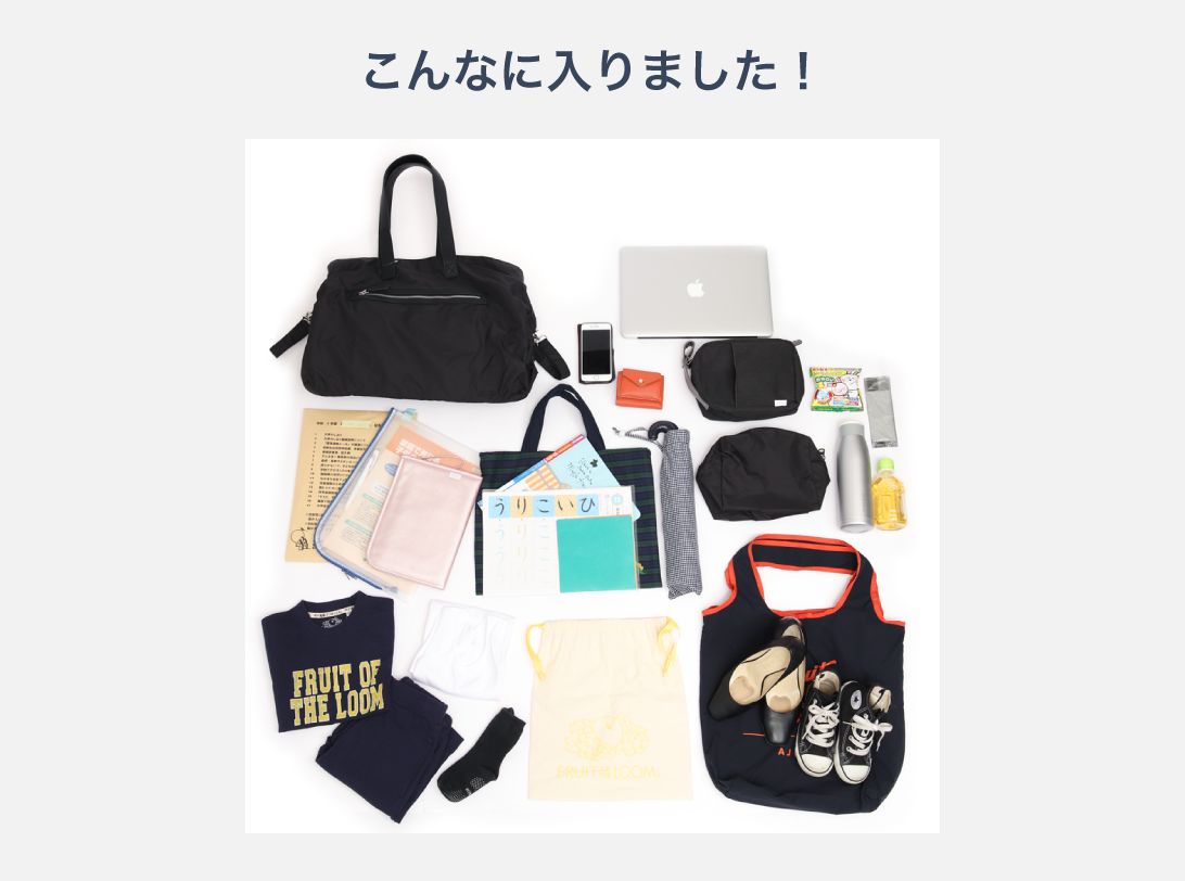 - 軽くて丈夫だけど、しっかり大容量なので私は一泊二日の旅行のときは必ずこのバッグを持ち歩いていきます。 家族みんなの荷物を中で3つに分けて入れておけるので、「あれ?どこにしまったっけ?」ってならずに便利です。カラーもブラックなので、パパが持っても良く似合います^^パソコン持ち歩くのにもラクなのだとか。