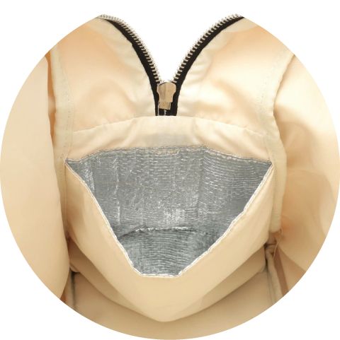 内側ドリンクポケット - 内側には哺乳瓶やペットボトルが入るポケットが付いています。暑い日に冷たいままお飲み物をしまっておけたり、適温でミルクを持参することが可能。ミルクを飲む赤ちゃんとお出かけするときにも活躍します。