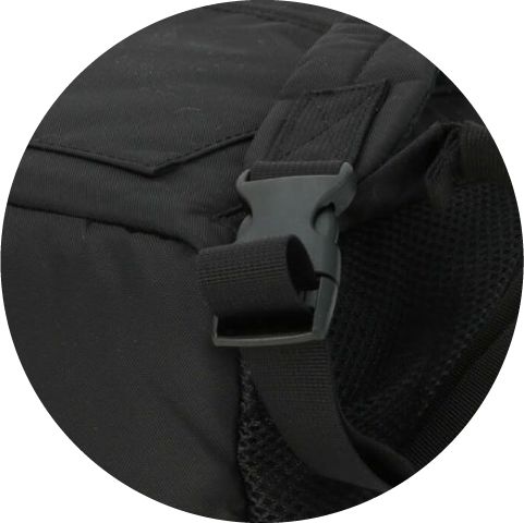 着脱できるアジャスター付き - リュックのベルト部分には片手で取り外せるバックルが付いており、着脱がカンタン。お子さまを抱っこしたままでもリュックを下ろせます。ベルト裏はクッション性のある素材を使い、メッシュ仕様になっているので長時間背負っていてもムレづらく快適です。