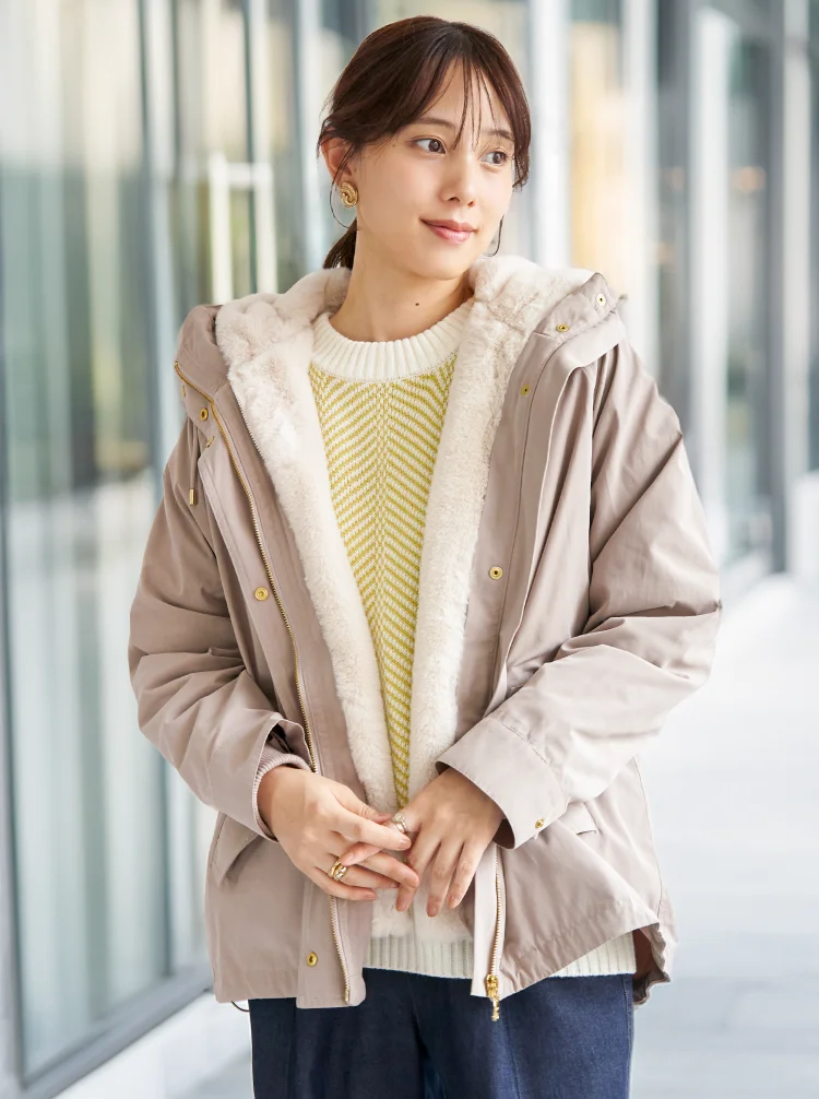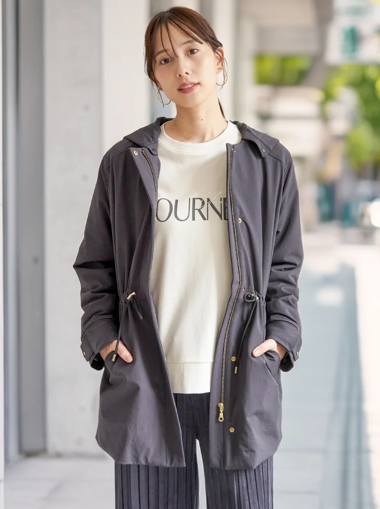 アウター+ライナー+フードでしっかり防寒。冷たい風を防ぎながら、軽い着心地で長時間でも快適。上品な光沢素材とゴールドパーツが、冬の装いを華やかに演出します。