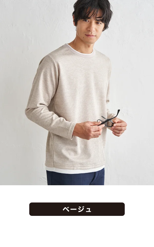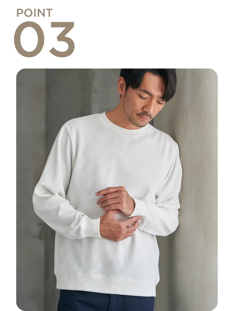 ワッフル編地で立体感をプラス。シンプルながら一枚でも着映えする仕上がりです。