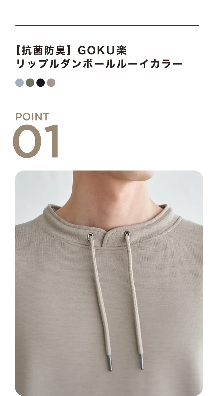 立ち上がりのあるルーイカラーが特徴のGOKU楽トップス。リップルダンボール素材の立体感が上品な印象を与え、カジュアルすぎない着こなしを叶えます。抗菌防臭機能付きで清潔感をキープでき、きれいめスタイルにも対応する大人のための一枚です。
