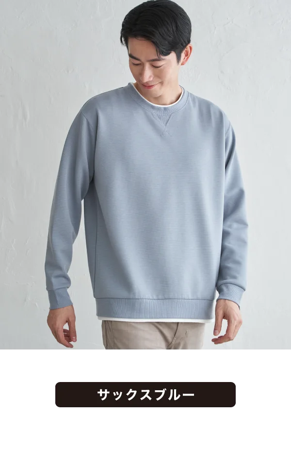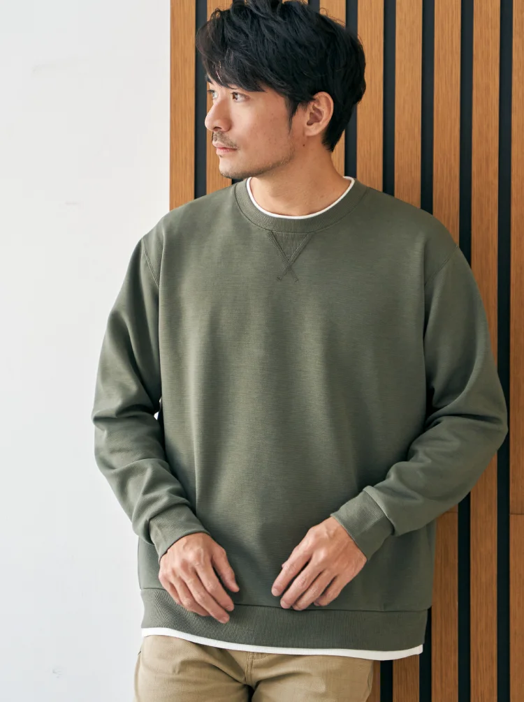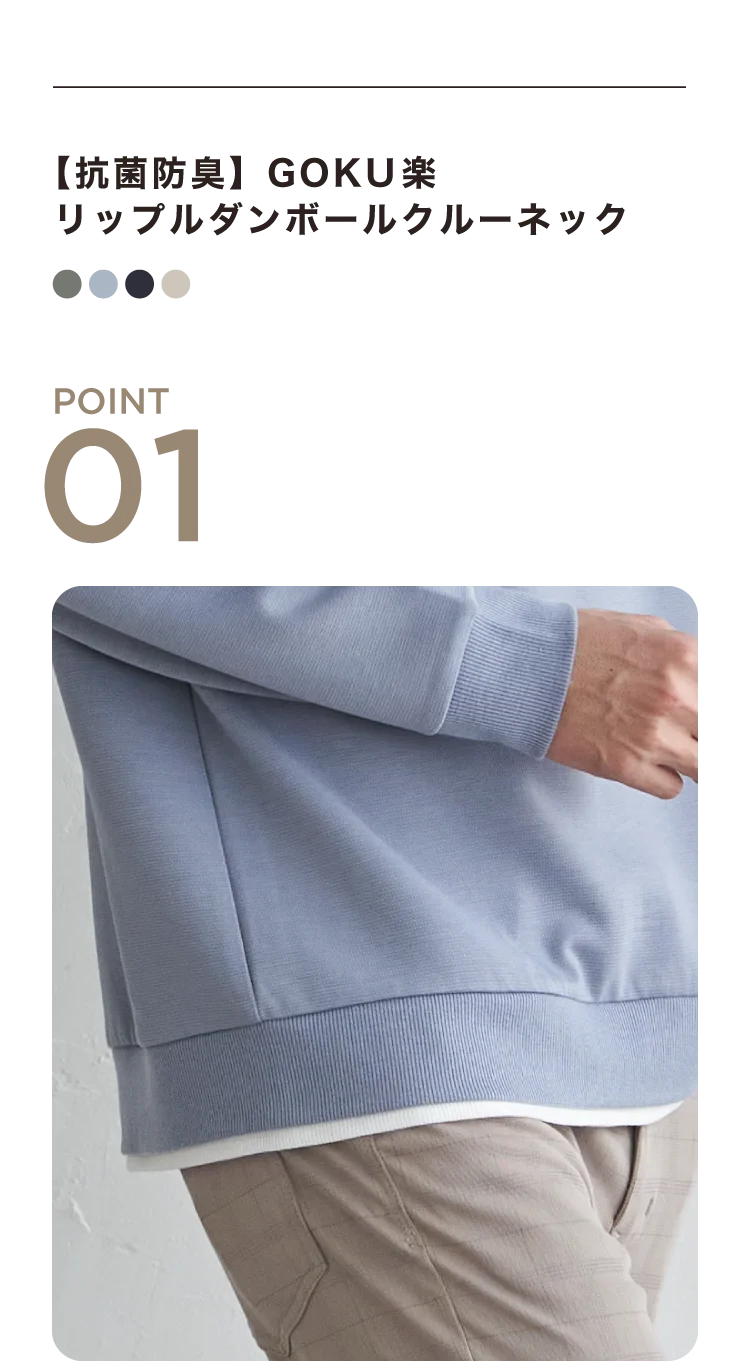 Tシャツを重ね着したようなフェイクレイヤードデザインが特徴のGOKU楽クルーネック。リップルダンボール素材による軽やかな着心地に加え、抗菌防臭機能付きで快適に着用できます。一枚でスタイリングが決まる、カジュアル派におすすめの即戦力トップスです。