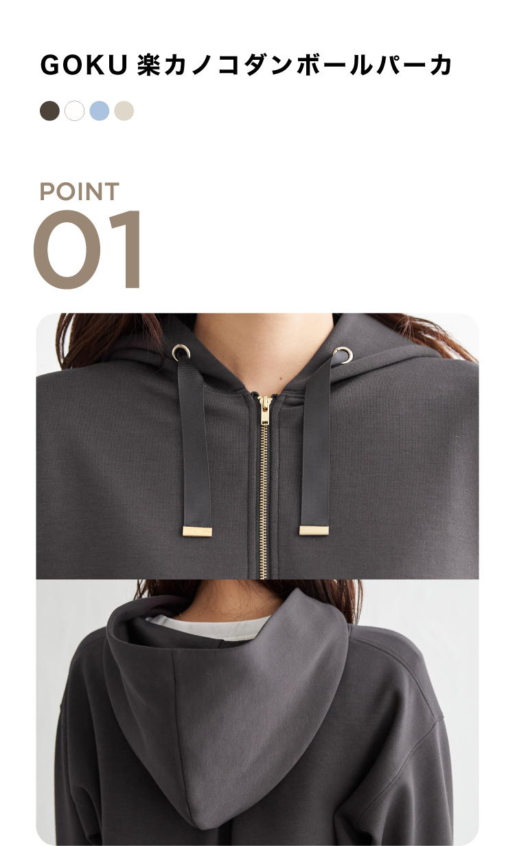 太めのグログランテープとゴールドカラーのパーツが高見え。立体感のあるフードも◎