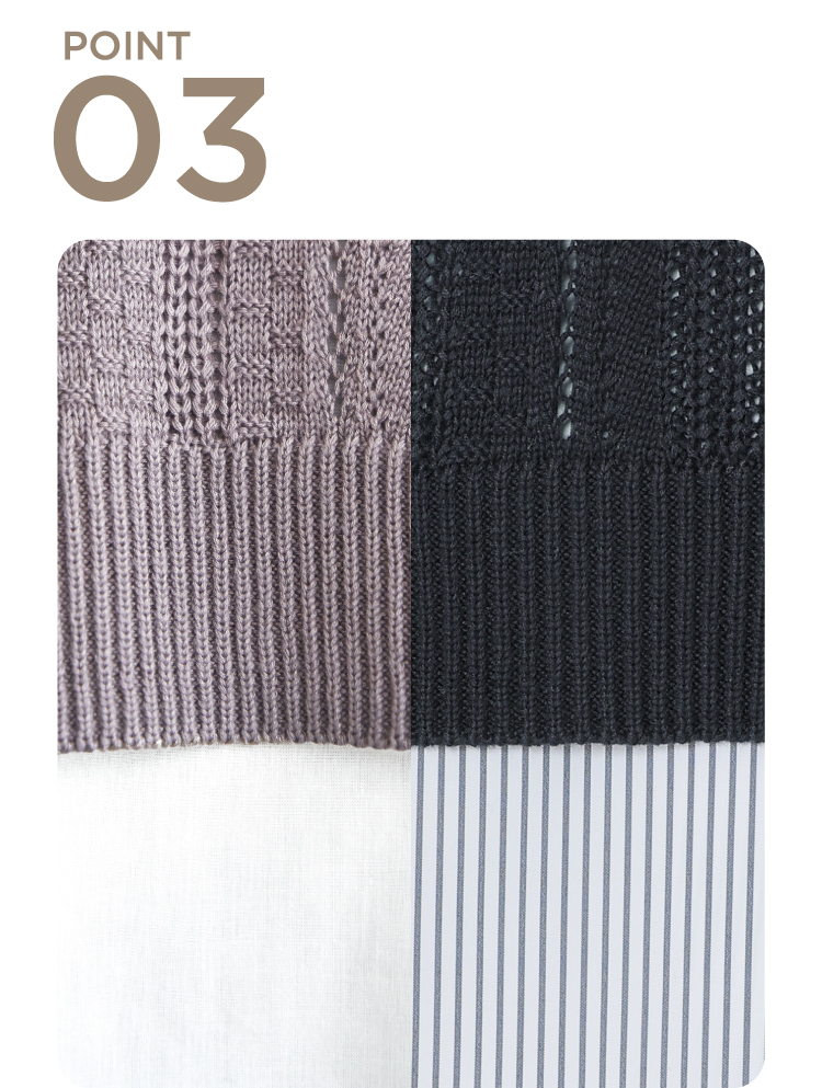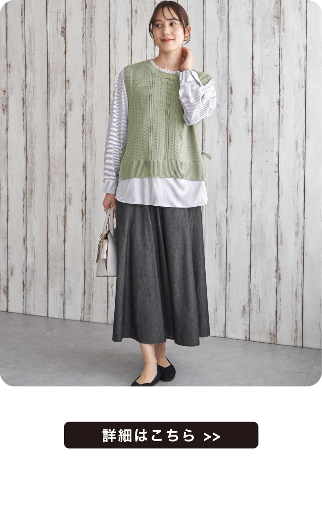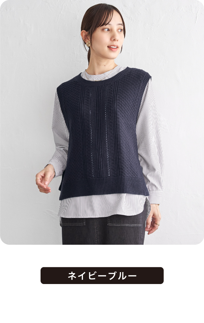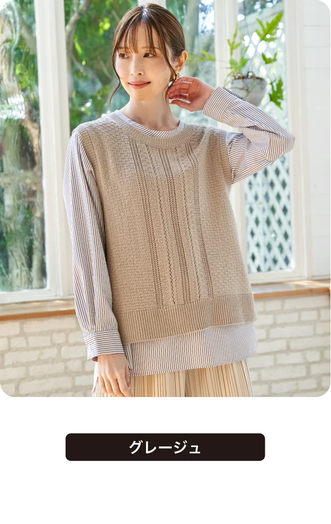 ブラウスはストライプと無地の2パターン展開。コーヒーカラーのニットベストのみ無地となります。