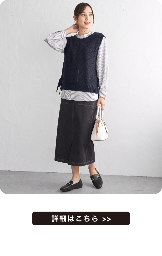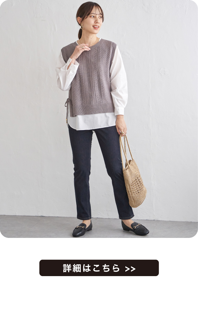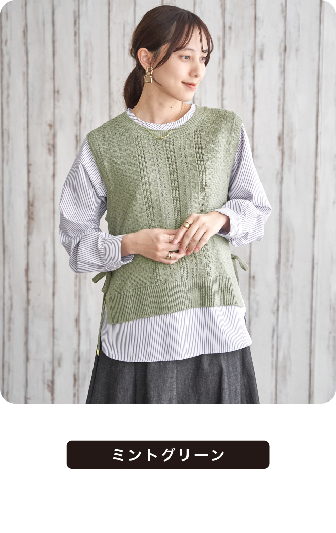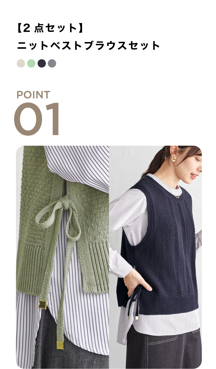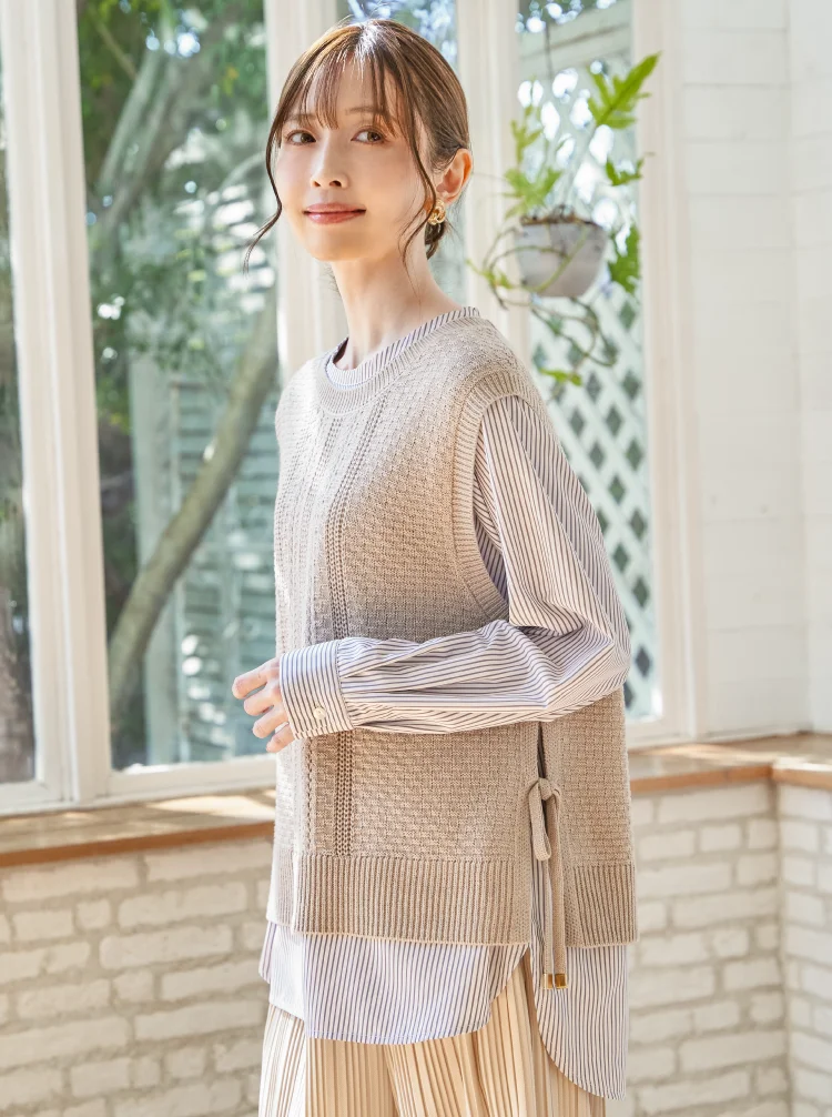 ニットベストとブラウスを組み合わせた、着こなしが決まる2点セット。サイドにあしらったリボンディテールが、ほどよいアクセントを添えます。それぞれ単品でも使えるため、スタイリングの幅が広がるアイテム。