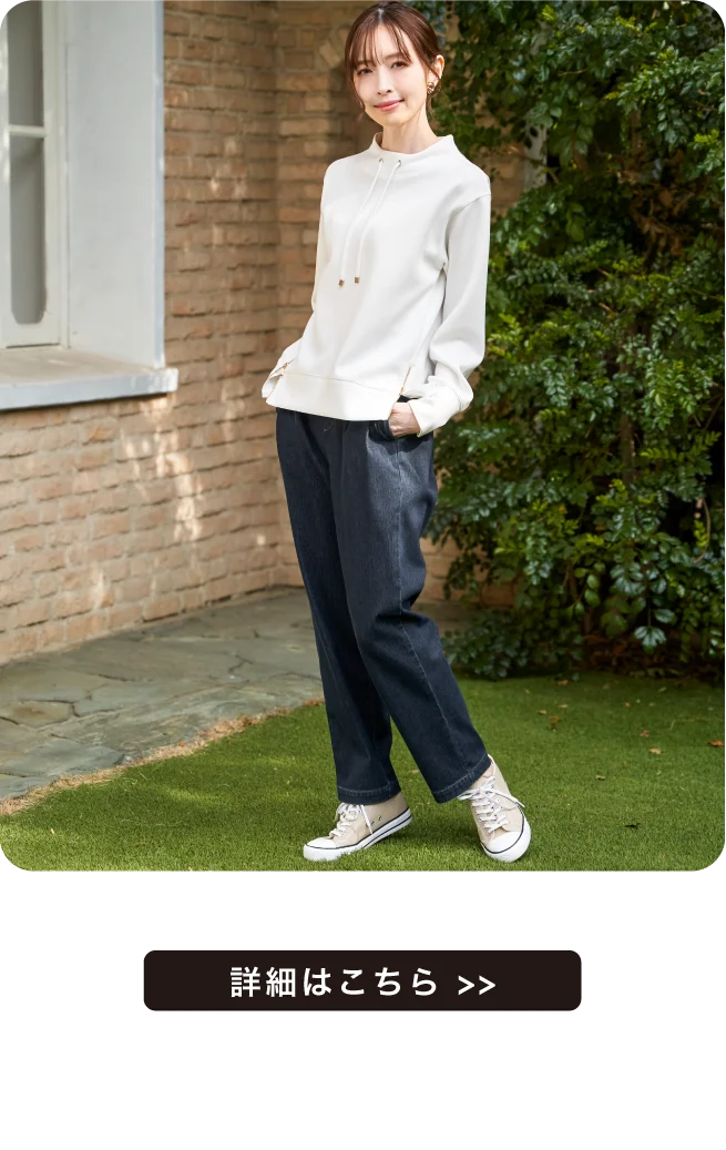 首元にきれいに沿ったモックネックはカジュアル過ぎず大人な雰囲気の抜け感を演出。