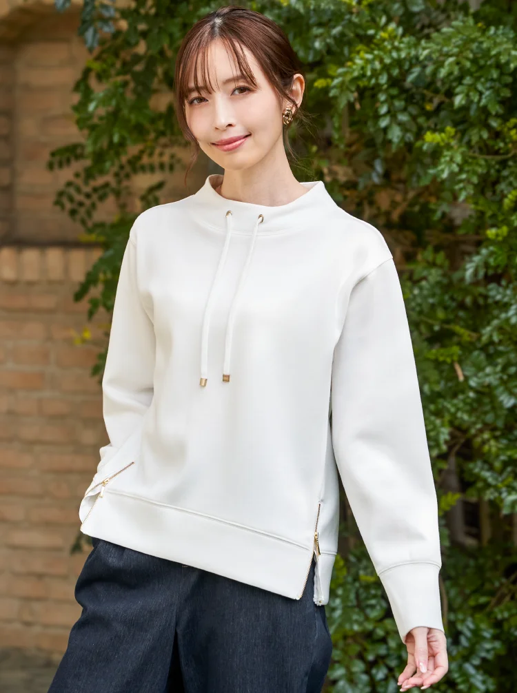 ikka で大人気、GOKU楽鹿の子ダンボールシリーズのプルオーバー。裾のファスナースリットは開閉でシルエットの変化を楽しめ、さりげなくあしらったゴールドカラーのパーツが上品なアクセントに。ドライタッチとやわらかさにこだわりました。