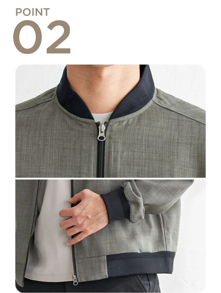 襟・袖・裾に配したリブがさりげないアクセントに。身頃と微配色でまとめた、ikkaらしい上品なスタンドブルゾンデザインです。