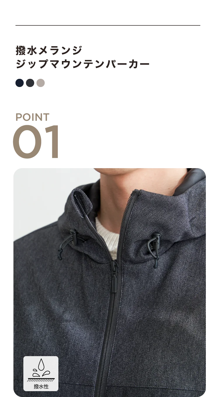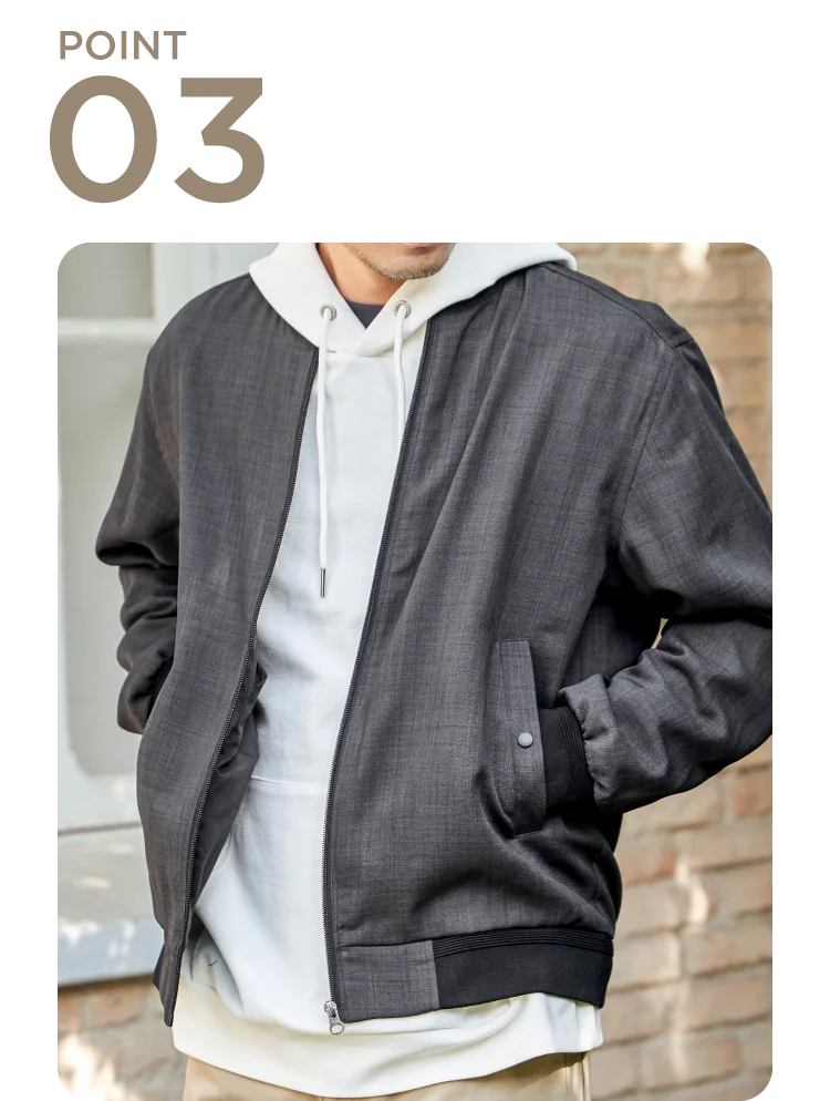 奥行きのあるメランジ調素材が大人っぽさを演出。前立てのないすっきりとしたジップデザインで、洗練された印象に仕上げました。