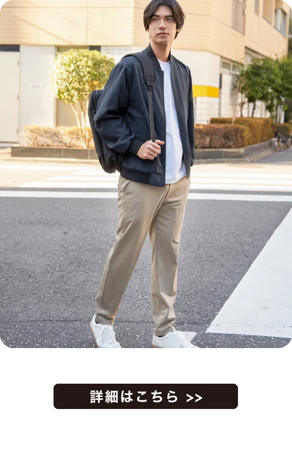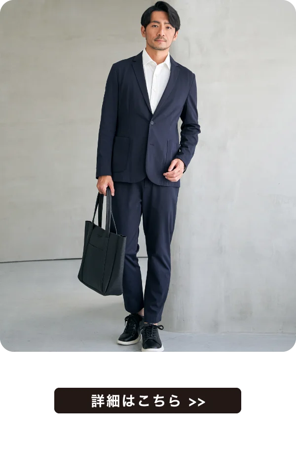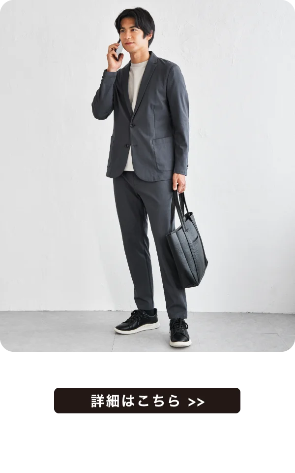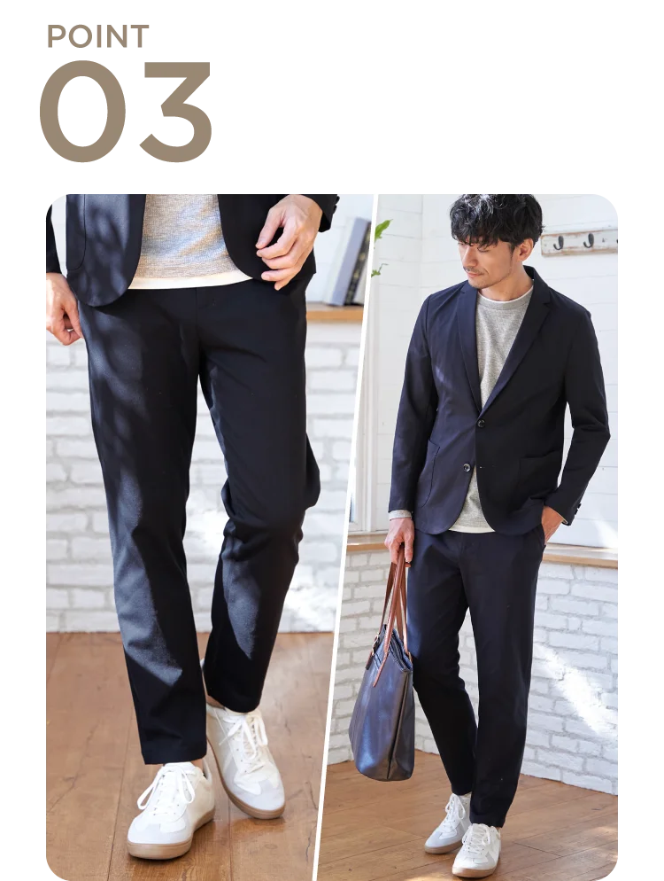 ボトムはテーパードシルエットで脚をすっきりと見せてくれます。クセになるやわらかな履き心地で、日常からビジネスカジュアルまで幅広く活躍するセットアップです。