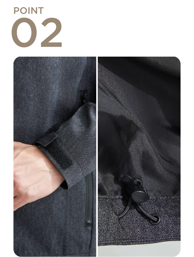 袖口はベルクロ仕様でフィット感を調整可能。フードと裾のドローコードでシルエットの変化をつけられ、風の侵入も軽減します。