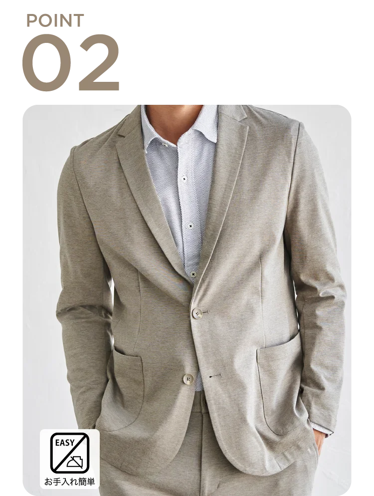 軽量でやわらかなジャージ仕立てながら、きちんと見えする2ボタンデザイン。羽織るだけで大人の上品な印象に仕上がります