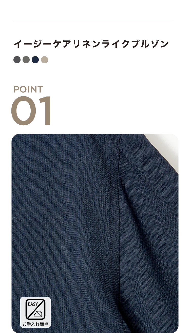 清涼感のある麻調素材で軽くさらっとした肌触りが魅力。メランジ見えの上品な風合いながらシワになりにくく、お手入れも簡単です。
