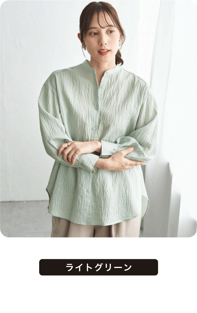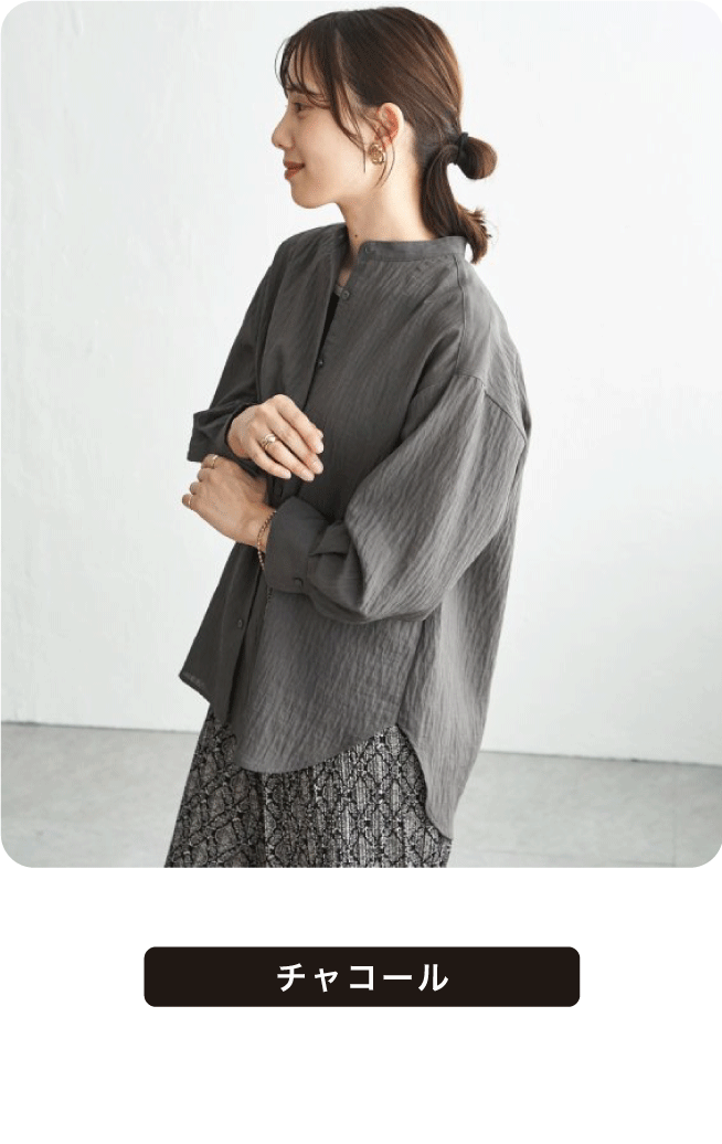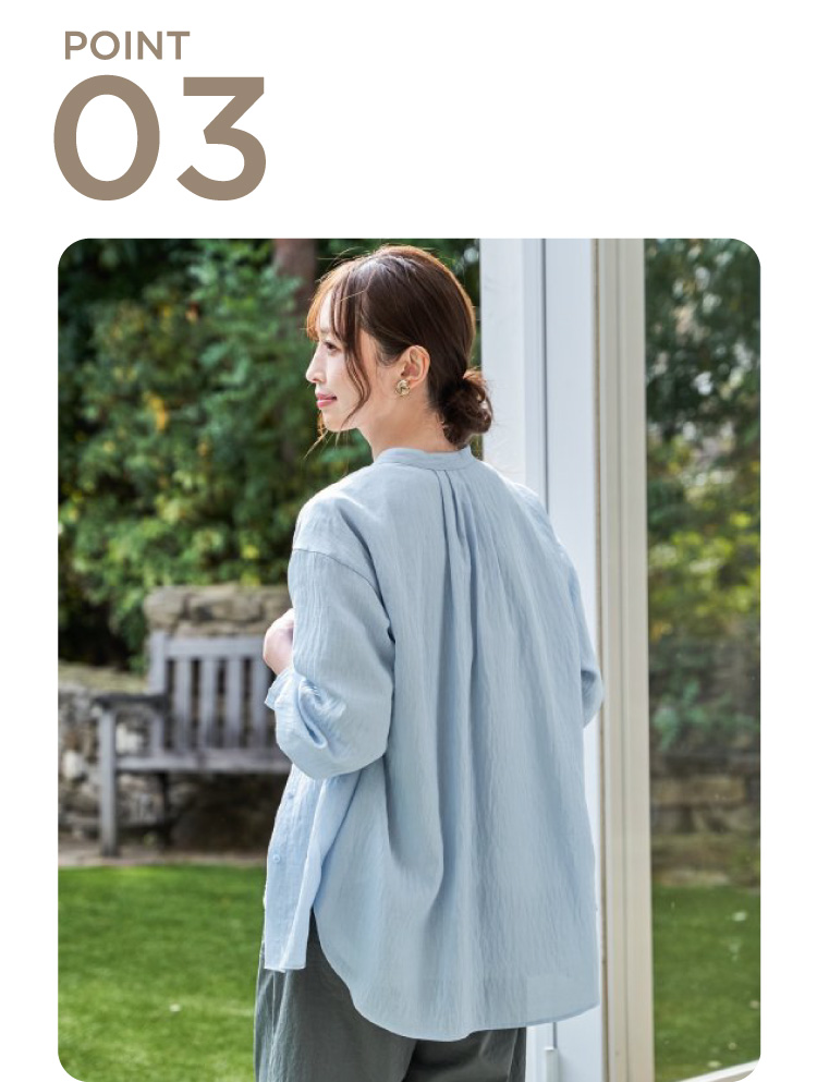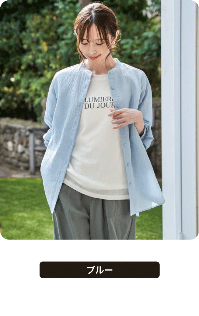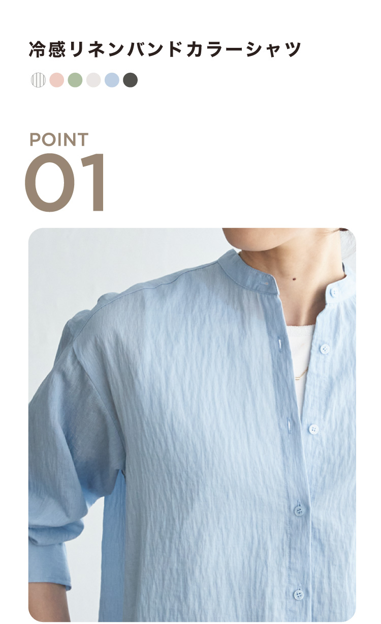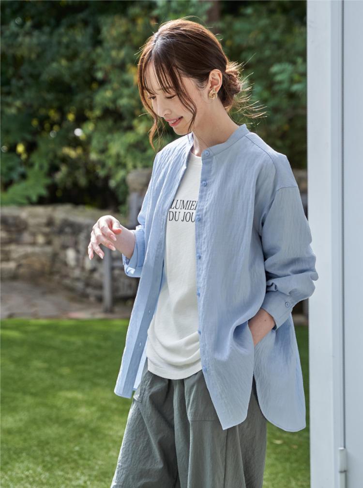 ほんのり透けるリネン素材が、涼しげな印象をつくるバンドカラーシャツ。さらりとした着心地で、日差しの強い日や冷房の効いた室内でも快適に過ごせます。一枚着としてはもちろん、軽く羽織るスタイルにも活躍する着回し力の高いアイテム。