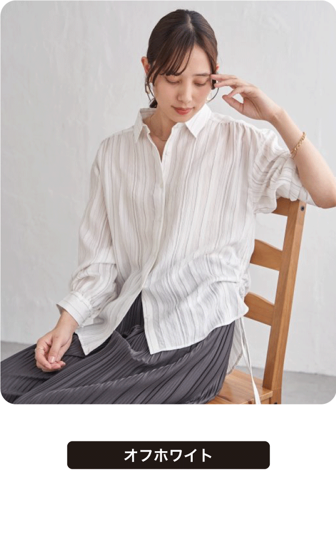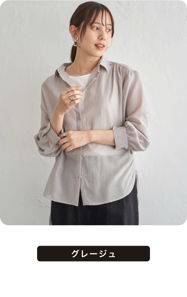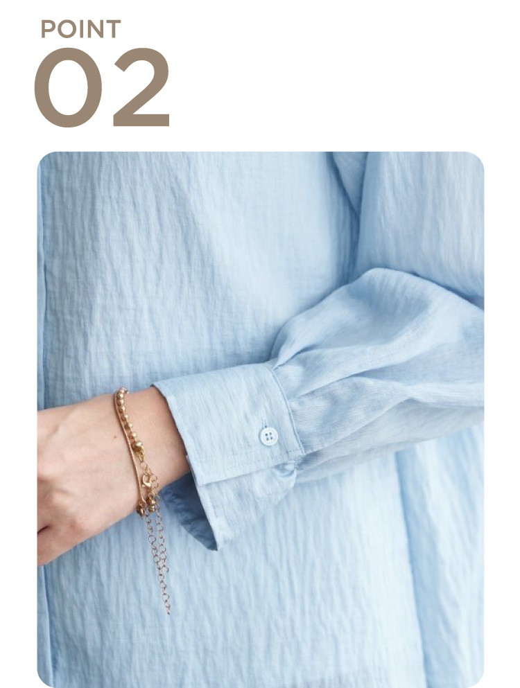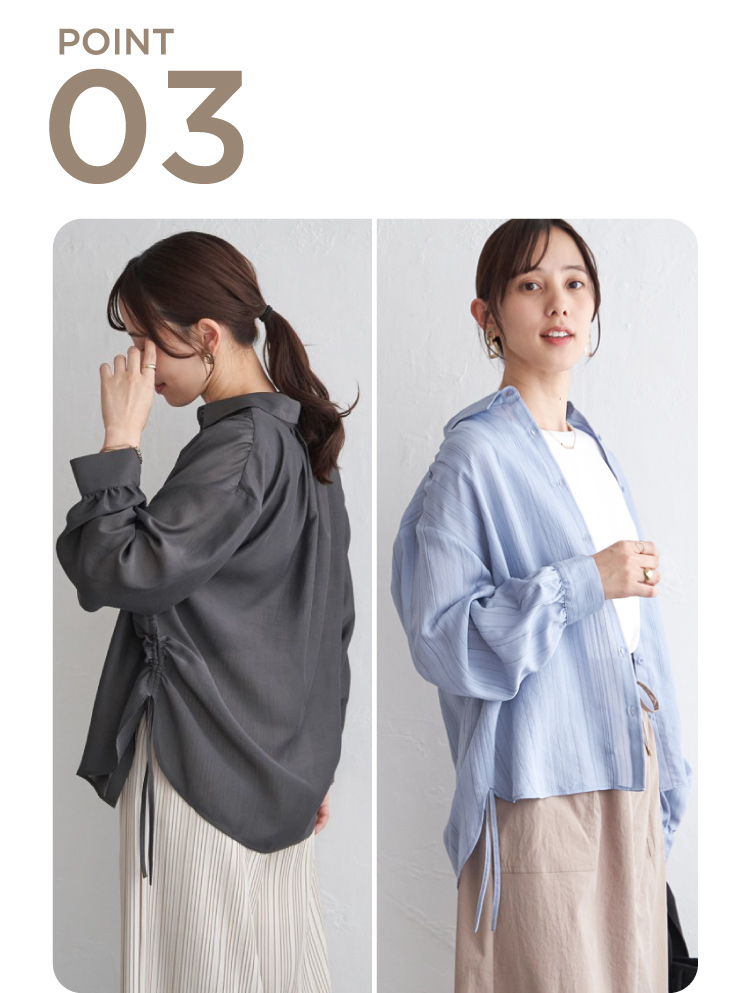 肩・袖口のギャザーと、しっとりとした落ち感でフェミニンな印象のシャツ。