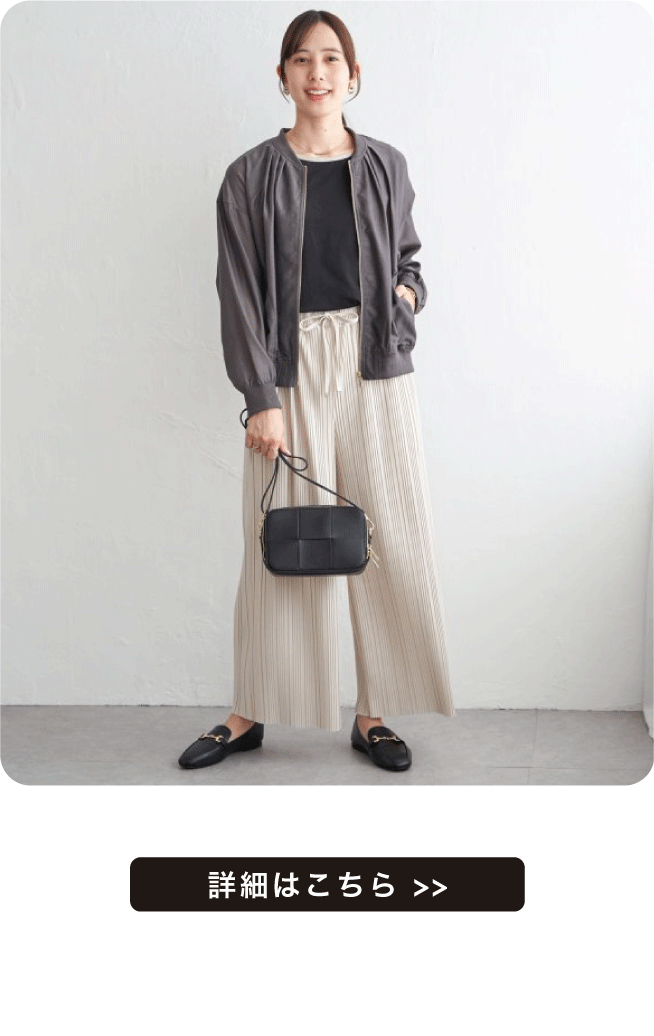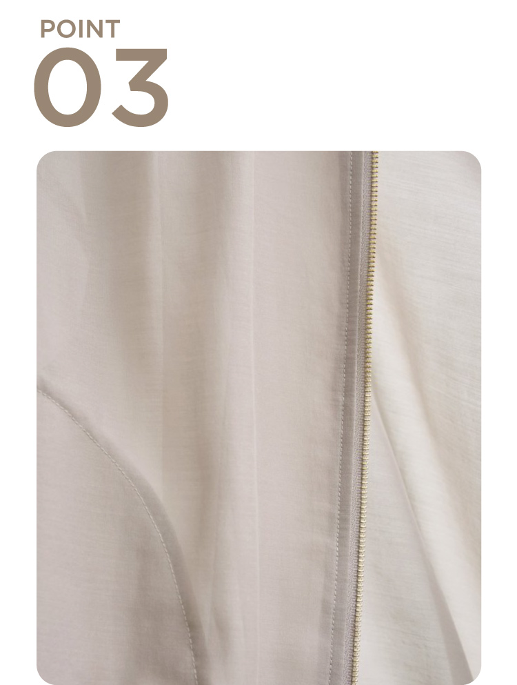 きれいめな光沢とシアー感のあるライトな素材。ファスナーのゴールドカラー使いがアクセントに。