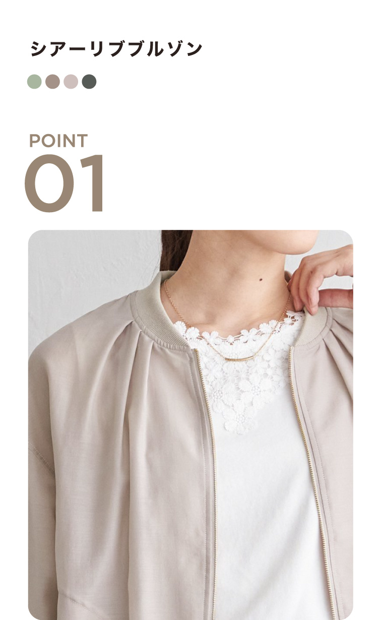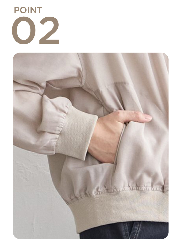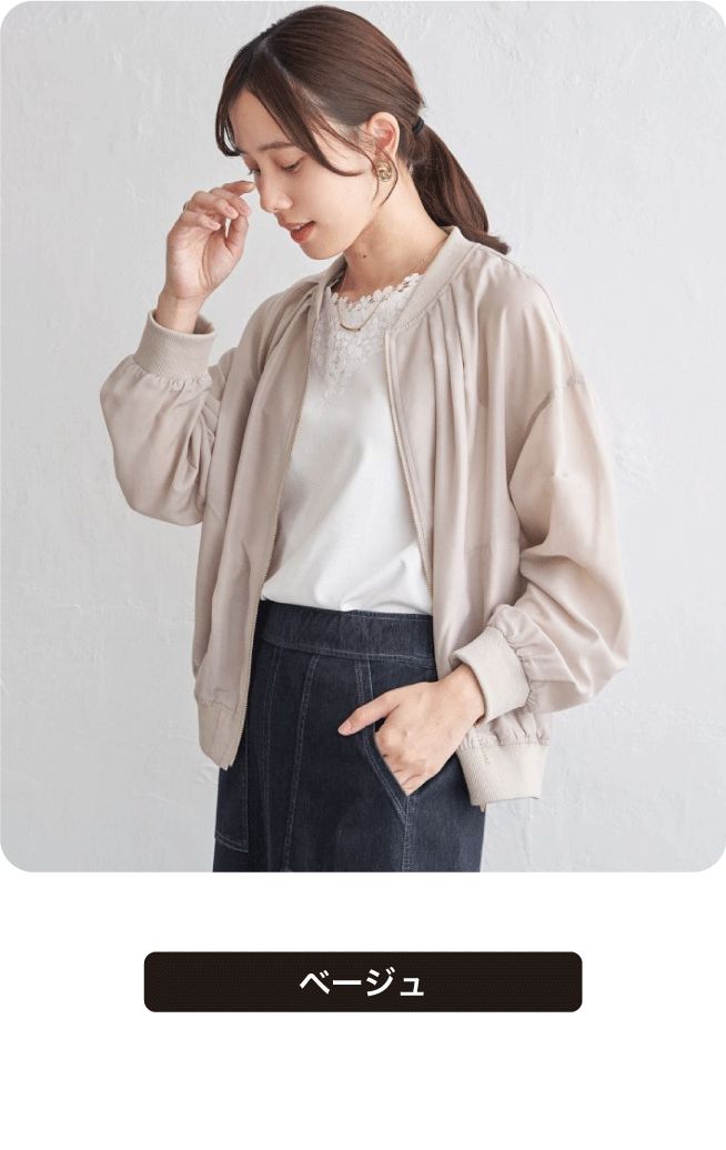 ほんのり光沢のあるシアー素材が軽やかな印象を与える、ライトな着心地のリブブルゾン。MA-1風のディテールを取り入れつつ、カジュアルに寄りすぎないバランスで幅広いスタイリングにマッチします。