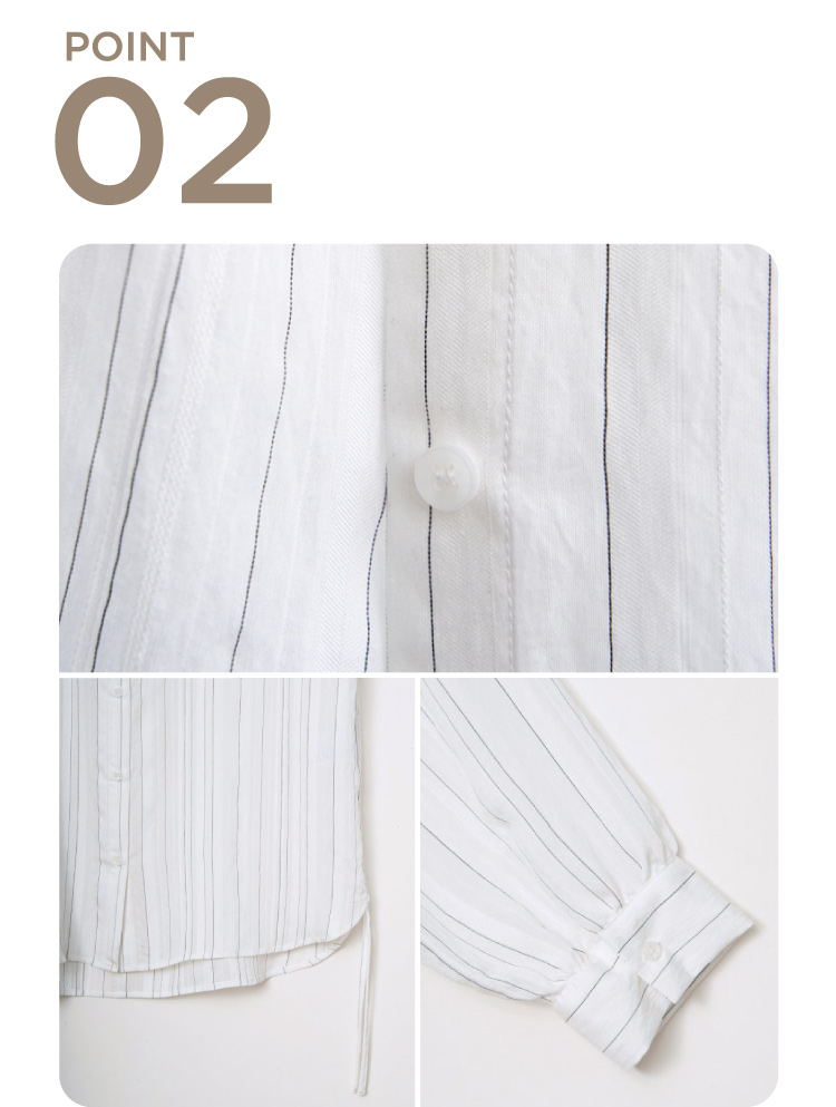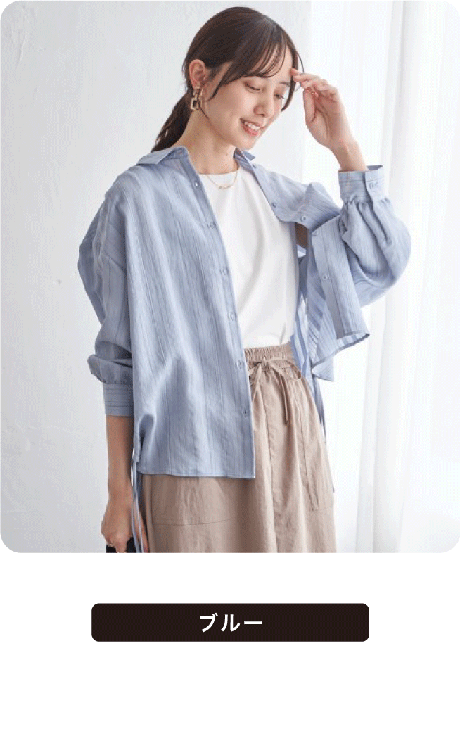 軽やかでさらりとした手触りの素材で、オフホワイトとブルーは先染めストライプ柄になっています。