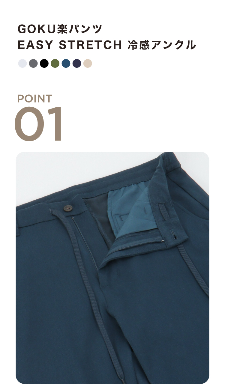 動きやすさときちんと感を兼ね備えたGOKU楽パンツ。総ゴムウエストでラクなのに、シルエットはすっきり。普段使いから通勤まで幅広く対応。スマートな快適さをプラスします。