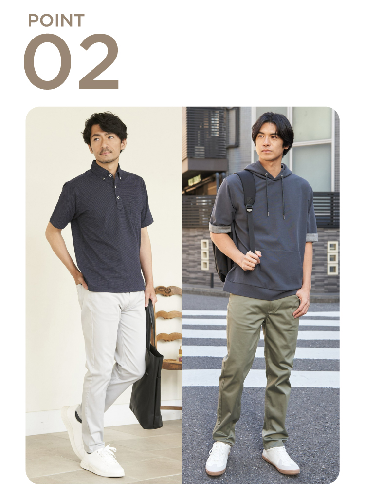 カジュアルすぎないちょうどいいフィット感でスッキリ見え。
