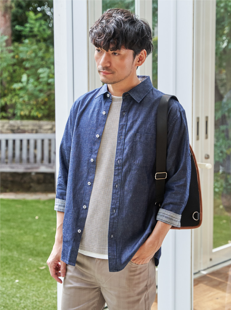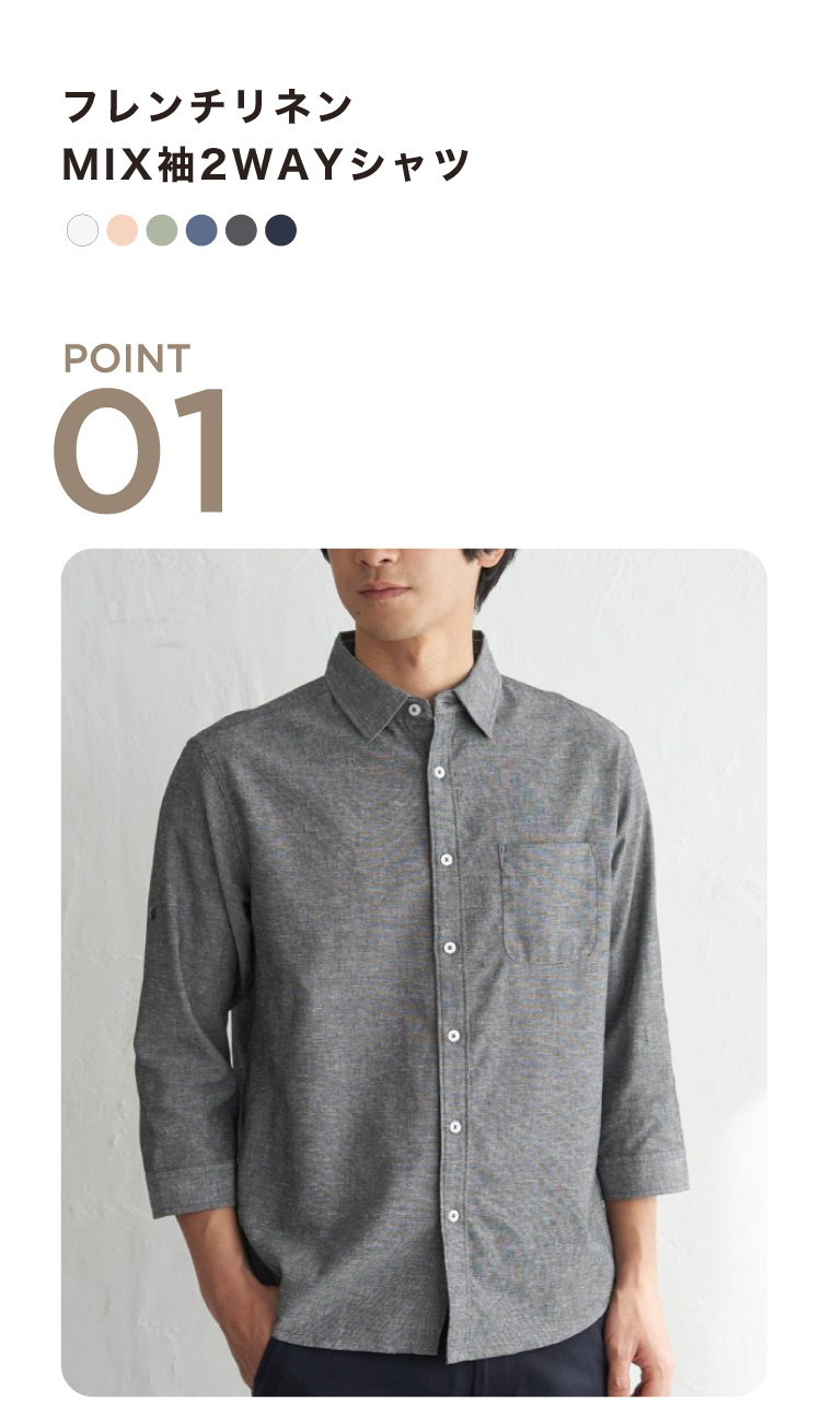 接触冷感機能が付いたフレンチリネンMIX素材のシャツ。袖のアレンジが可能な2WAY仕様で、季節やシーンに合わせて表情を変えられる一枚。