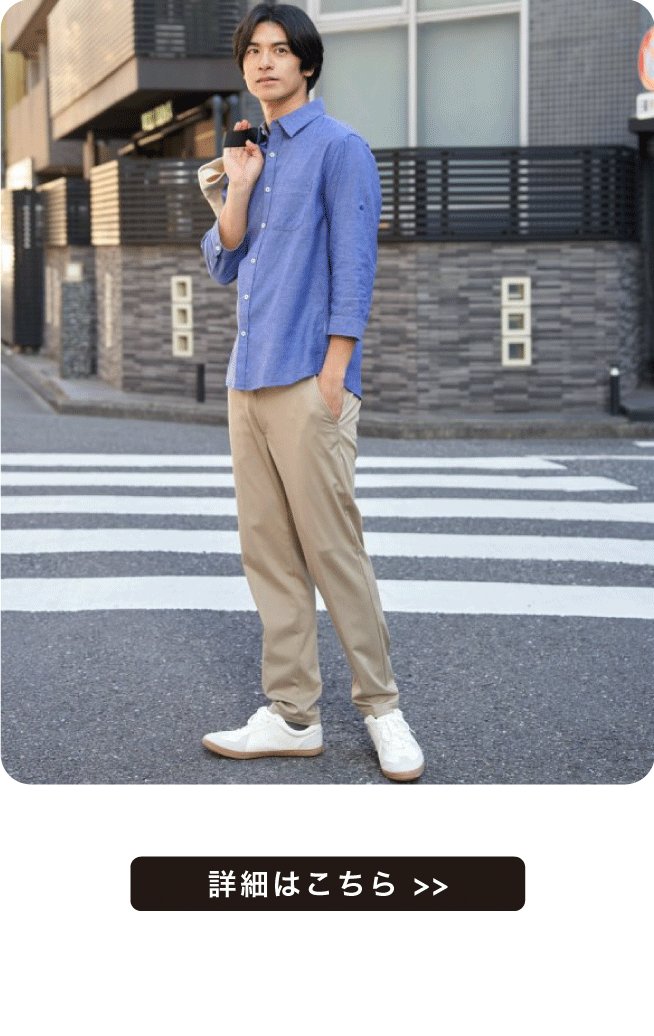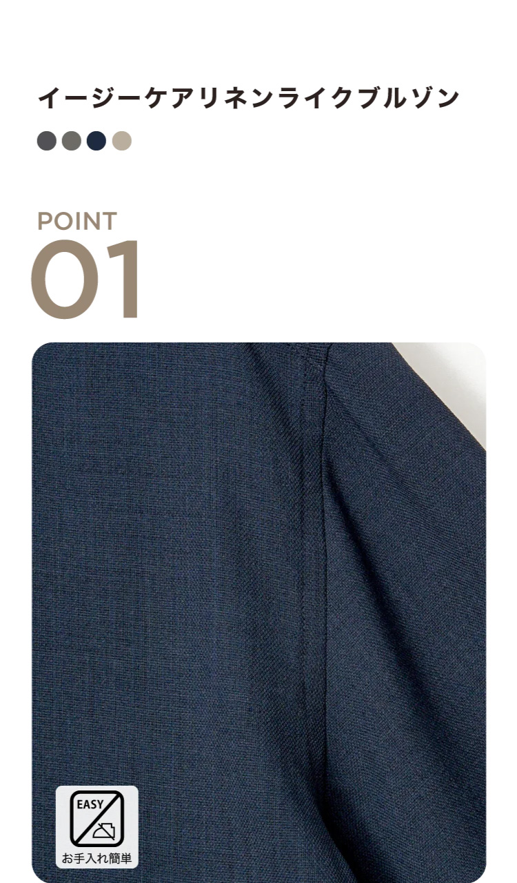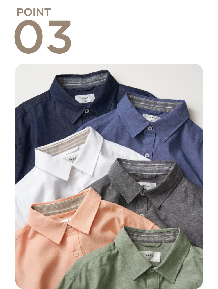 清涼感のある麻調素材で軽くさらっとした肌触りが魅力。メランジ見えの上品な風合いながらシワになりにくく、お手入れも簡単です。