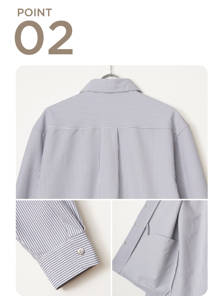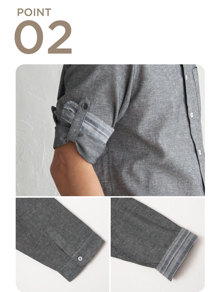 カフス裏がストライプ柄になっているため、カフスを折って着るのもおすすめ。今季からは袖丈調整のしやすいロールアップ仕様になりました。
