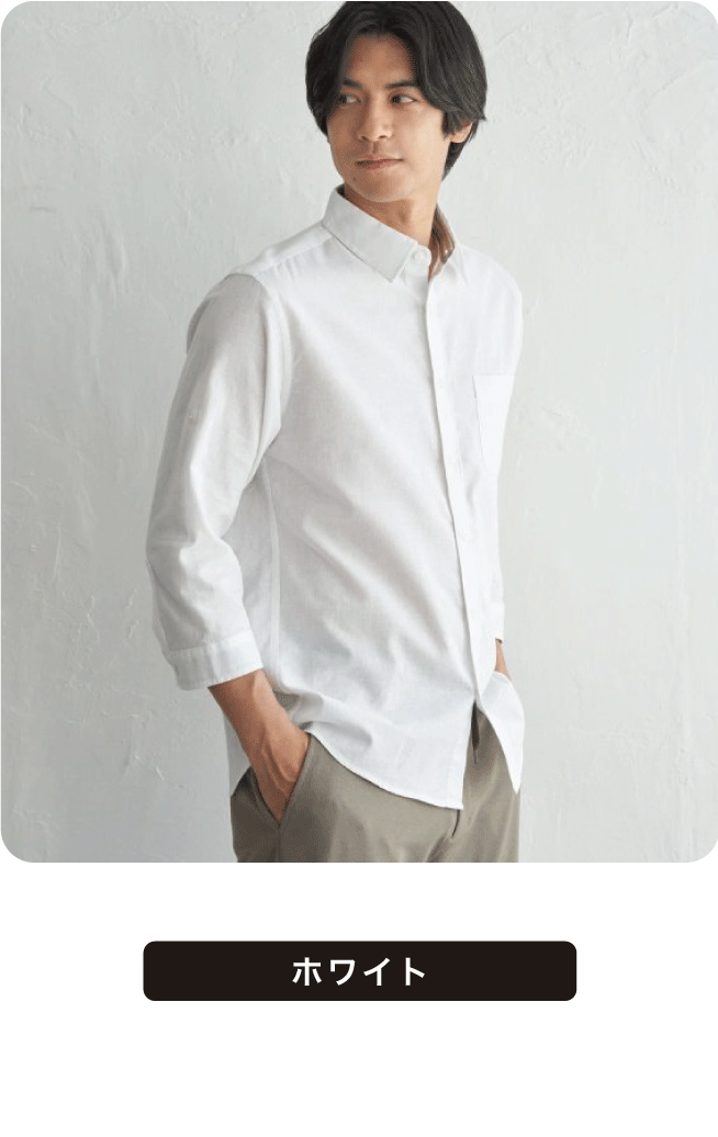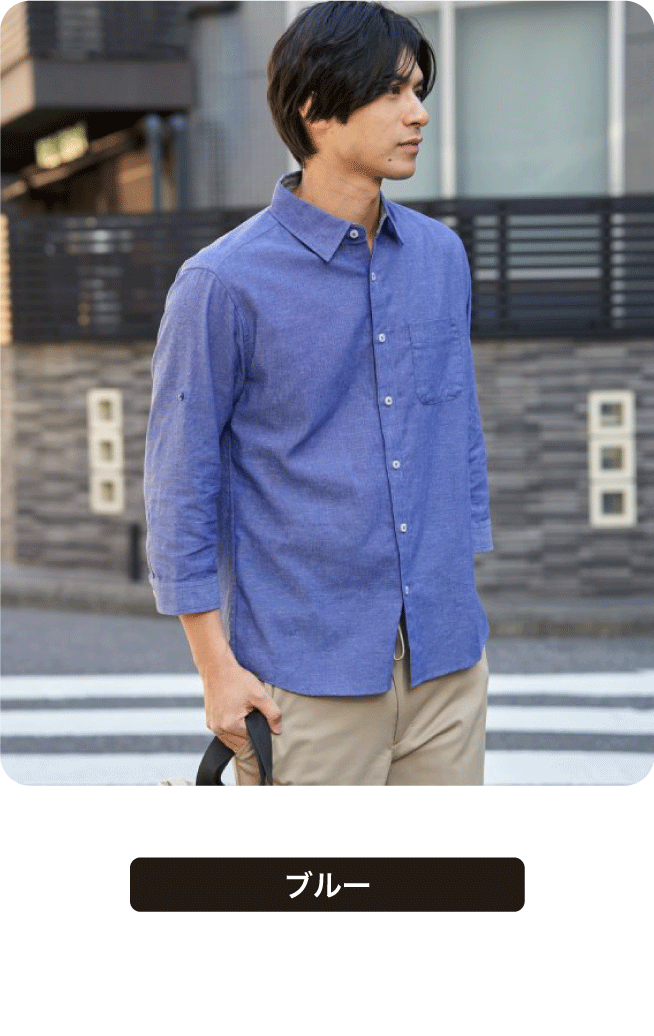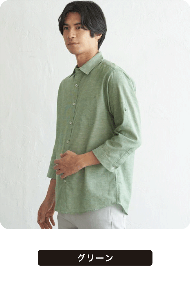 お手入れが楽な7分袖レギュラーカラーリネン無地シャツ。