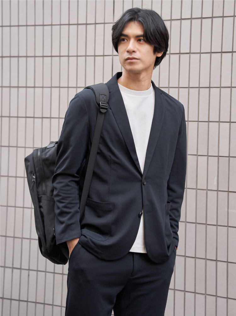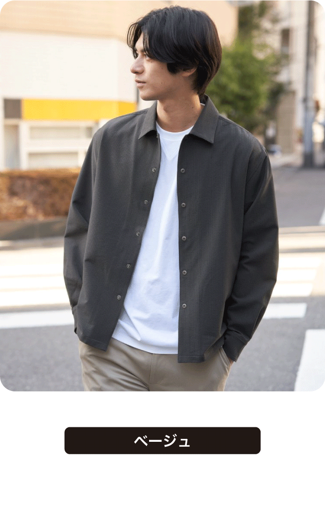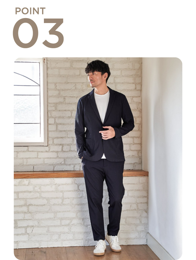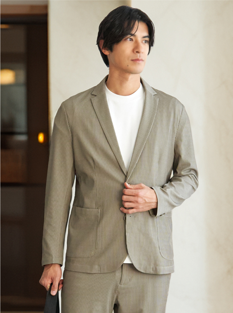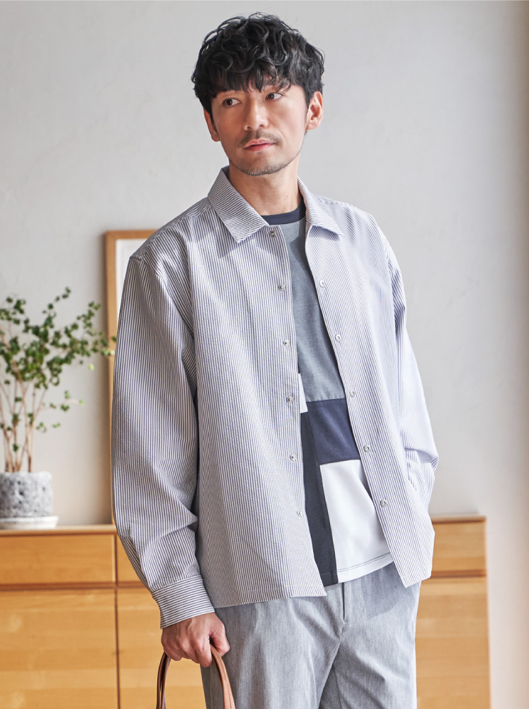 凹凸感のあるサッカージャージー素材を使用したセットアップ。清涼感があるのでこれからの季節にぴったりです。Tシャツの上にラフに羽織れば週末スタイルに、シャツと合わせればオフィスシーンにもと幅広く着回せます。