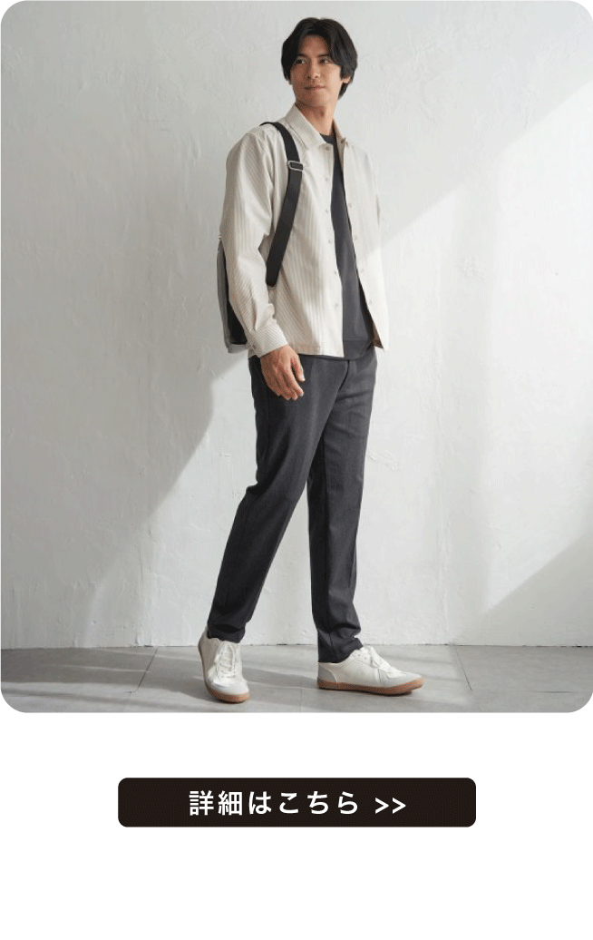 同シリーズ、ウエストイージー仕様のテーパードシルエットの別売りパンツとセットアップで着用可能です。