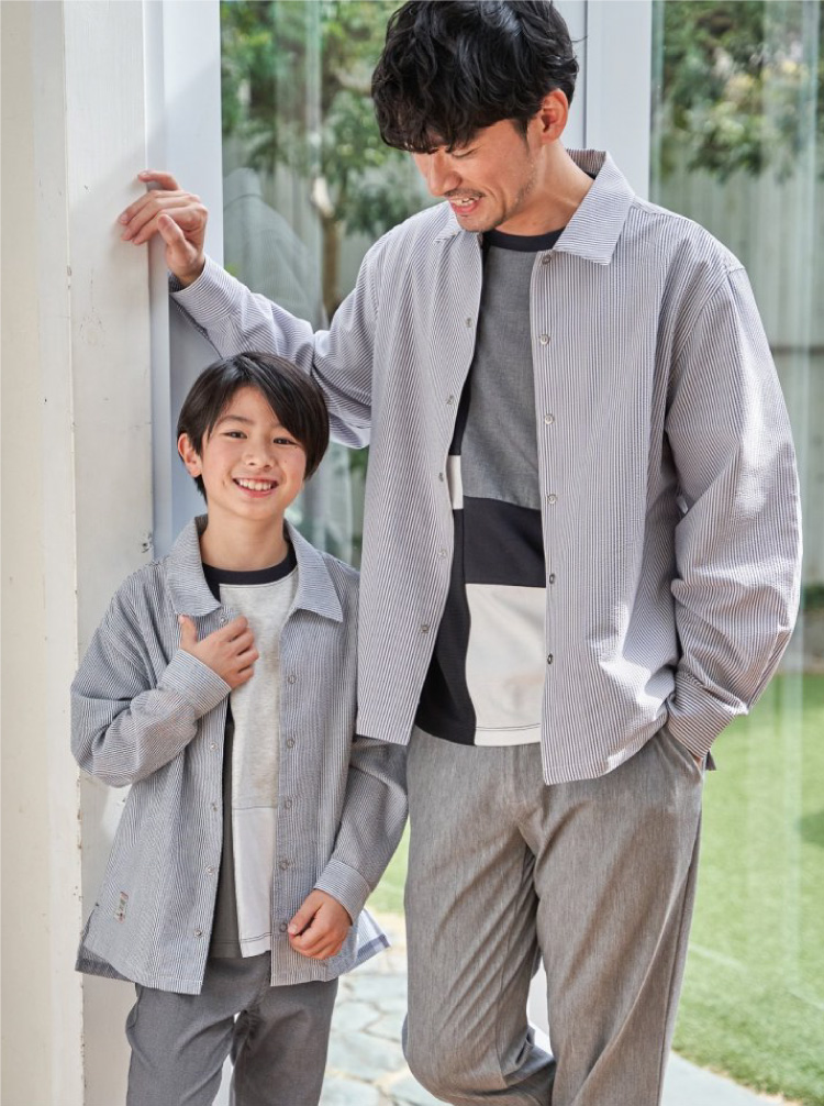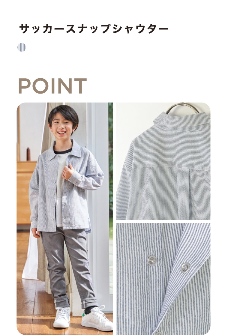 [ 120~160cm ] ¥2,990¥ 3,289 ポケットに切り替えたストライプ生地が爽やかさを添え、デイリーからお出かけまで活躍します。袖丈調整のしやすいロールアップ仕様になりました。
