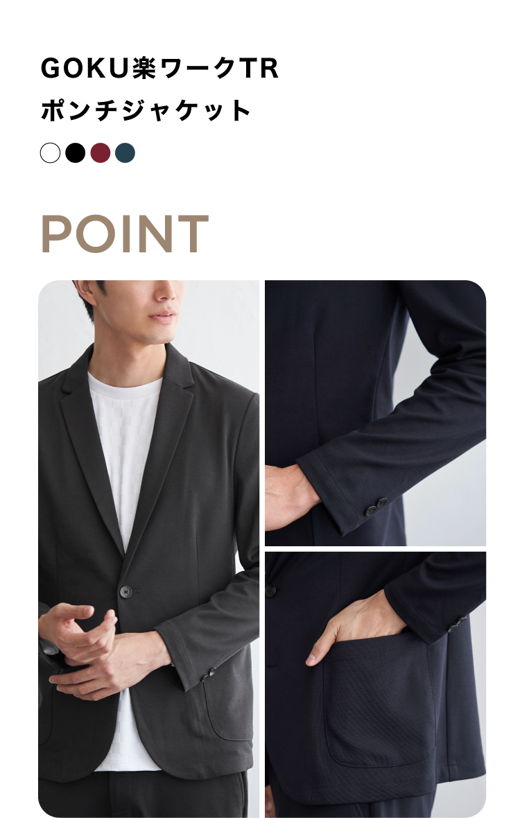 ビジネスにも日常にもフィットする、伸縮性に優れたTR(ポリエステル×レーヨン)ポンチ素材。360度ストレッチ仕様で、腕や肩まわりもストレスなく動かせる快適な着心地です。軽量化にもこだわり、長時間の着用でも疲れにくく、テレワークや移動の多い日にもおすすめ。きちんと感をキープしながら、アクティブに動ける一着です。