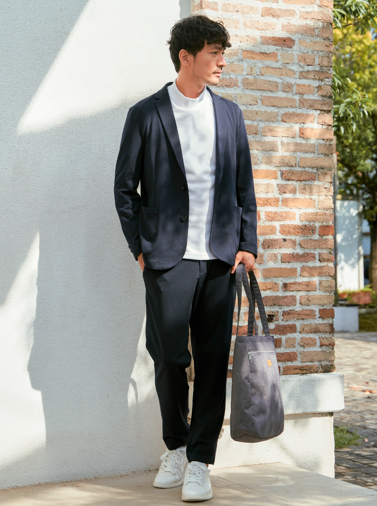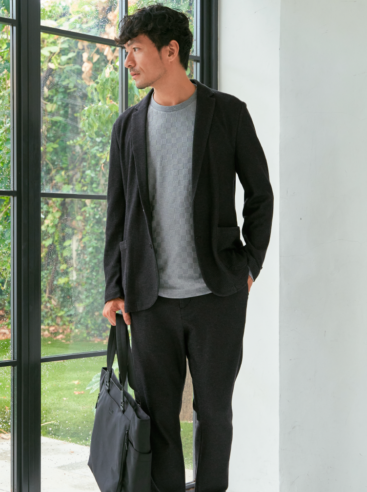 見た目に奥行きのある、ハニカム組織を使用したセットアップ。いつものオフィスカジュアルに差がつきます。Tシャツの上にラフに羽織れば週末スタイルに、シャツと合わせればオフィスシーンにもと幅広く着回せます。