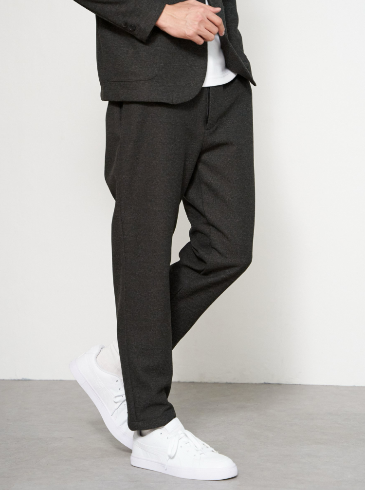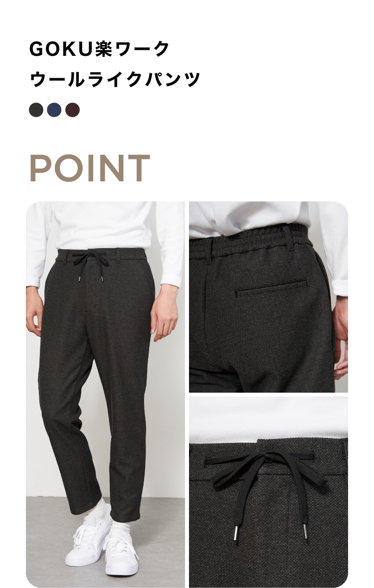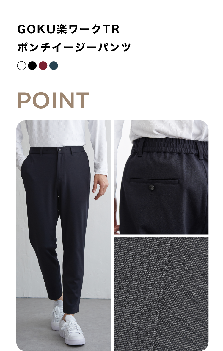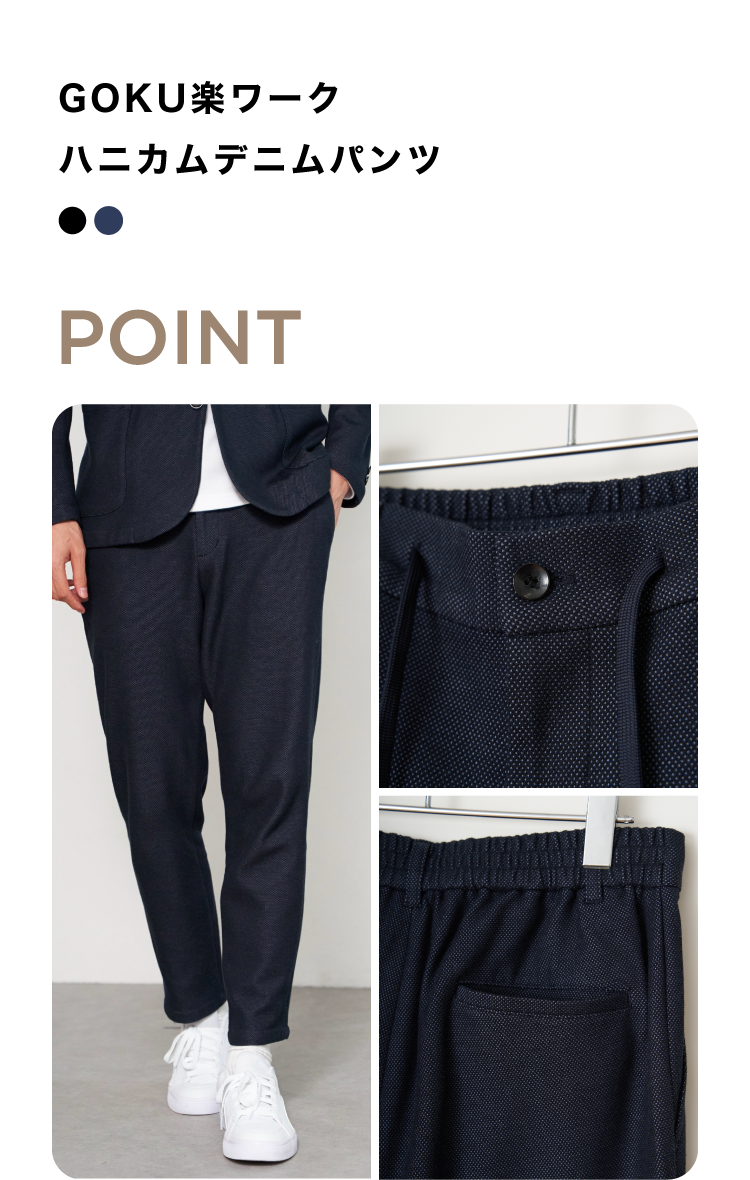 ウエストイージー仕様のテーパードシルエットです。