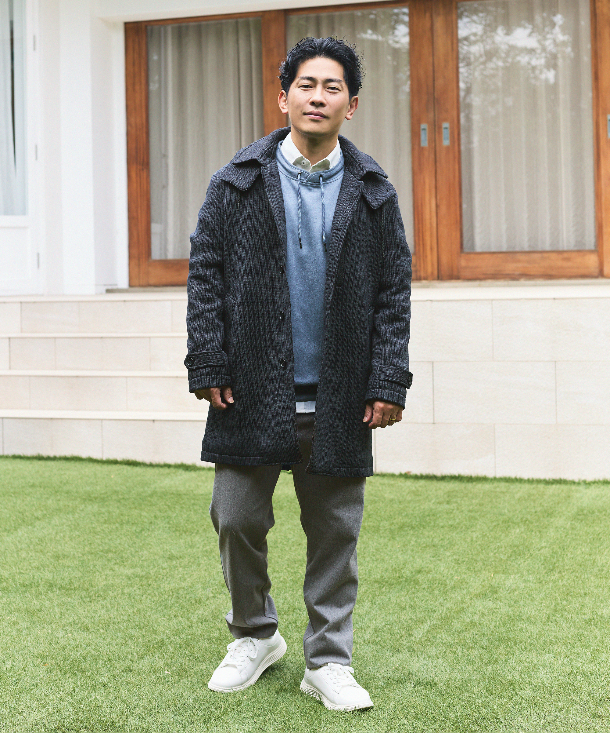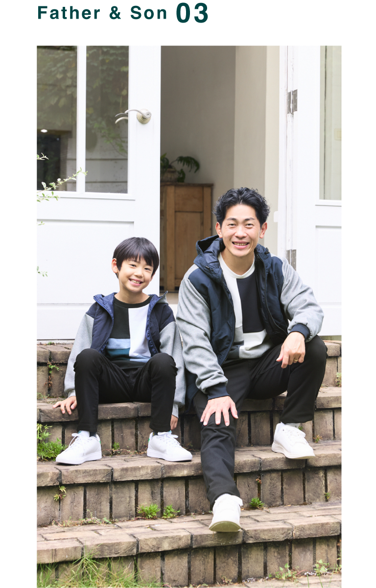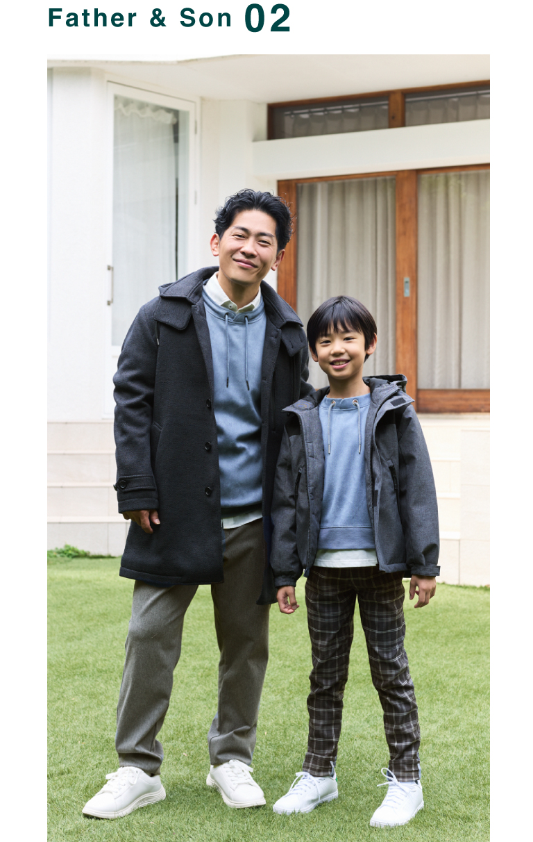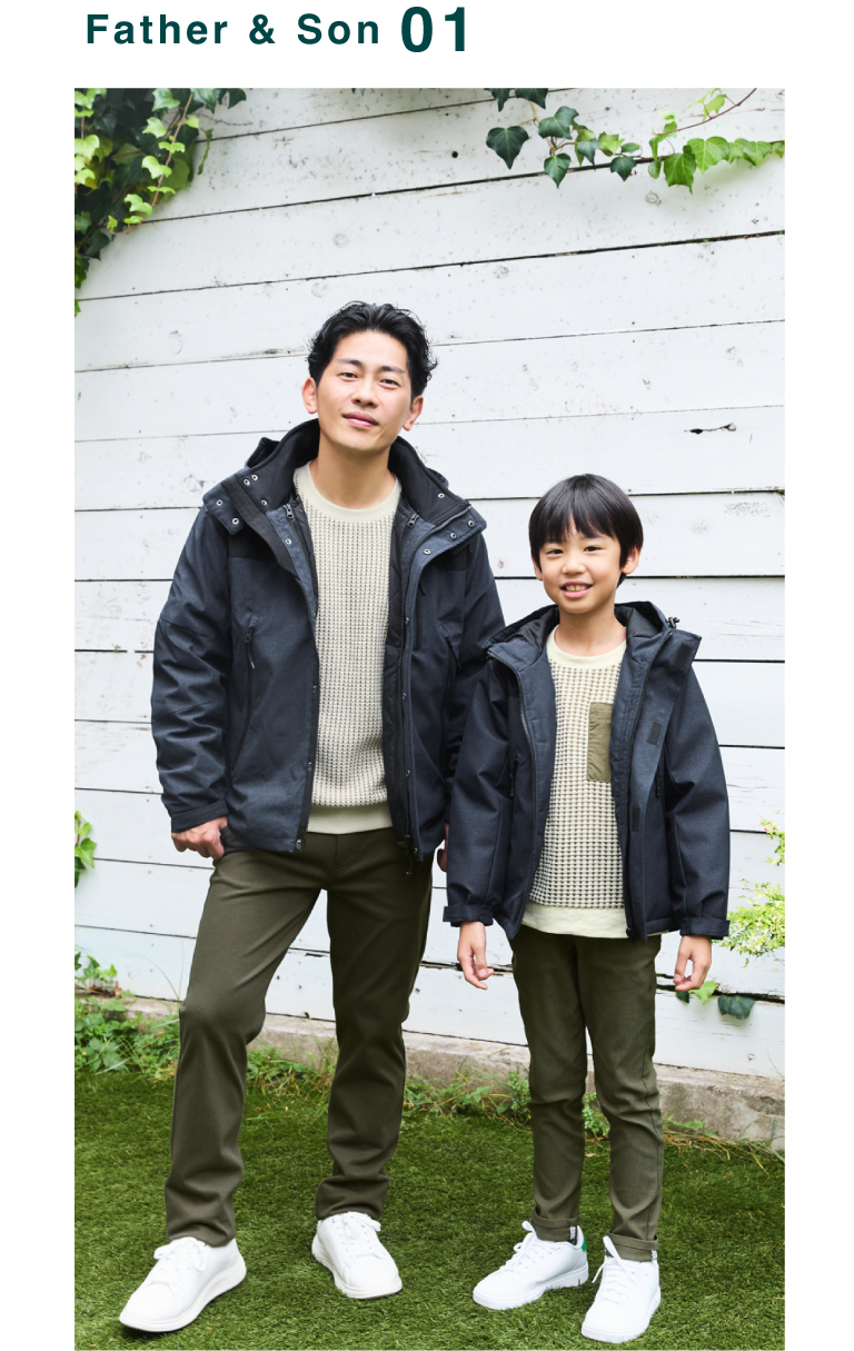 スエード調プルオーバーの上品な質感と、ikka ならではのルーイカラーが映える親子リンクスタイル。父はステンカラーコートで大人の余裕を、息子はマウンテンパーカーでアクティブな印象に。ボトムのトーンも合わせ、全体に調和のとれた仕上がり。上品さと遊び心を両立した、秋冬のお出かけにぴったりのスタイリングです。