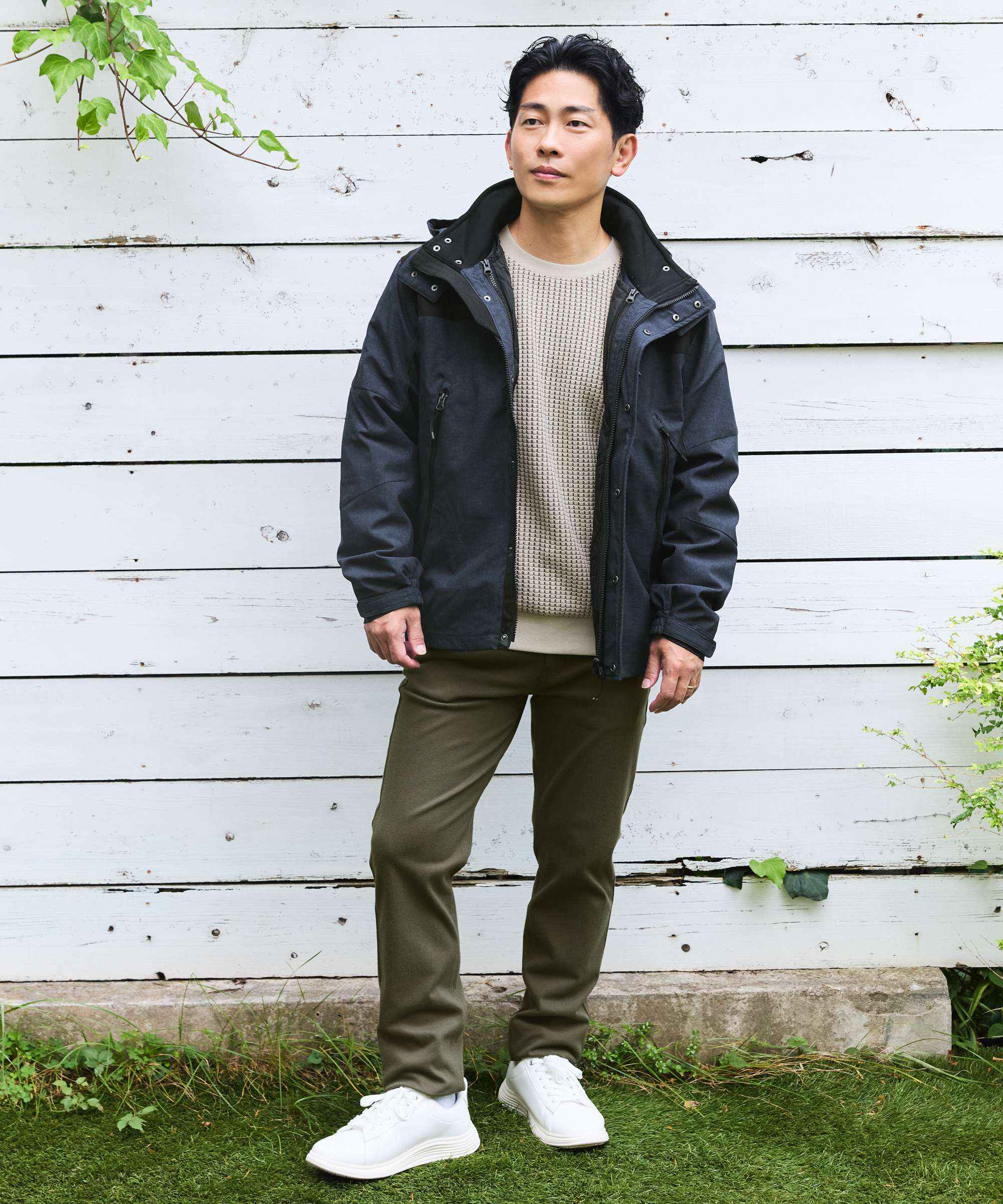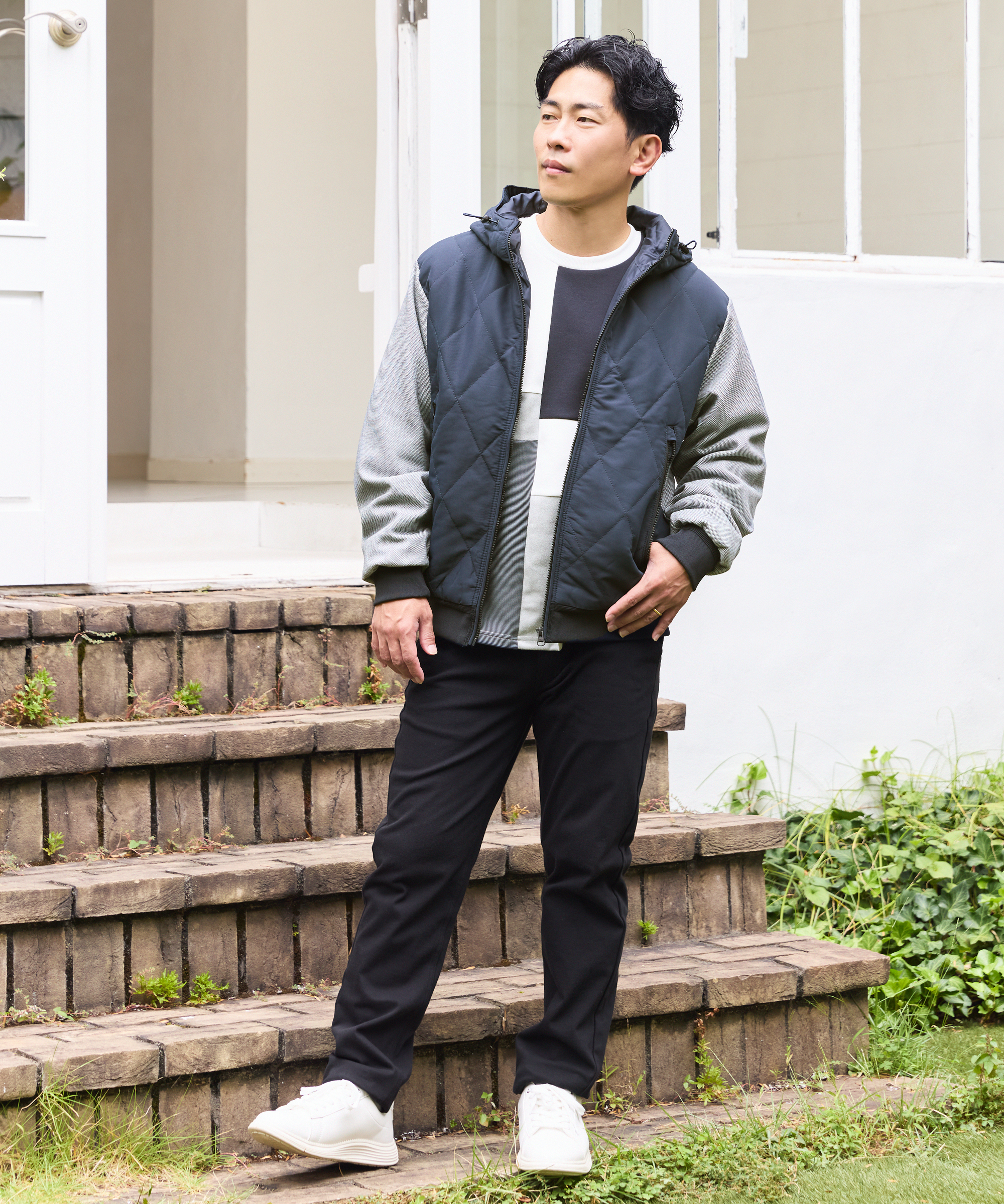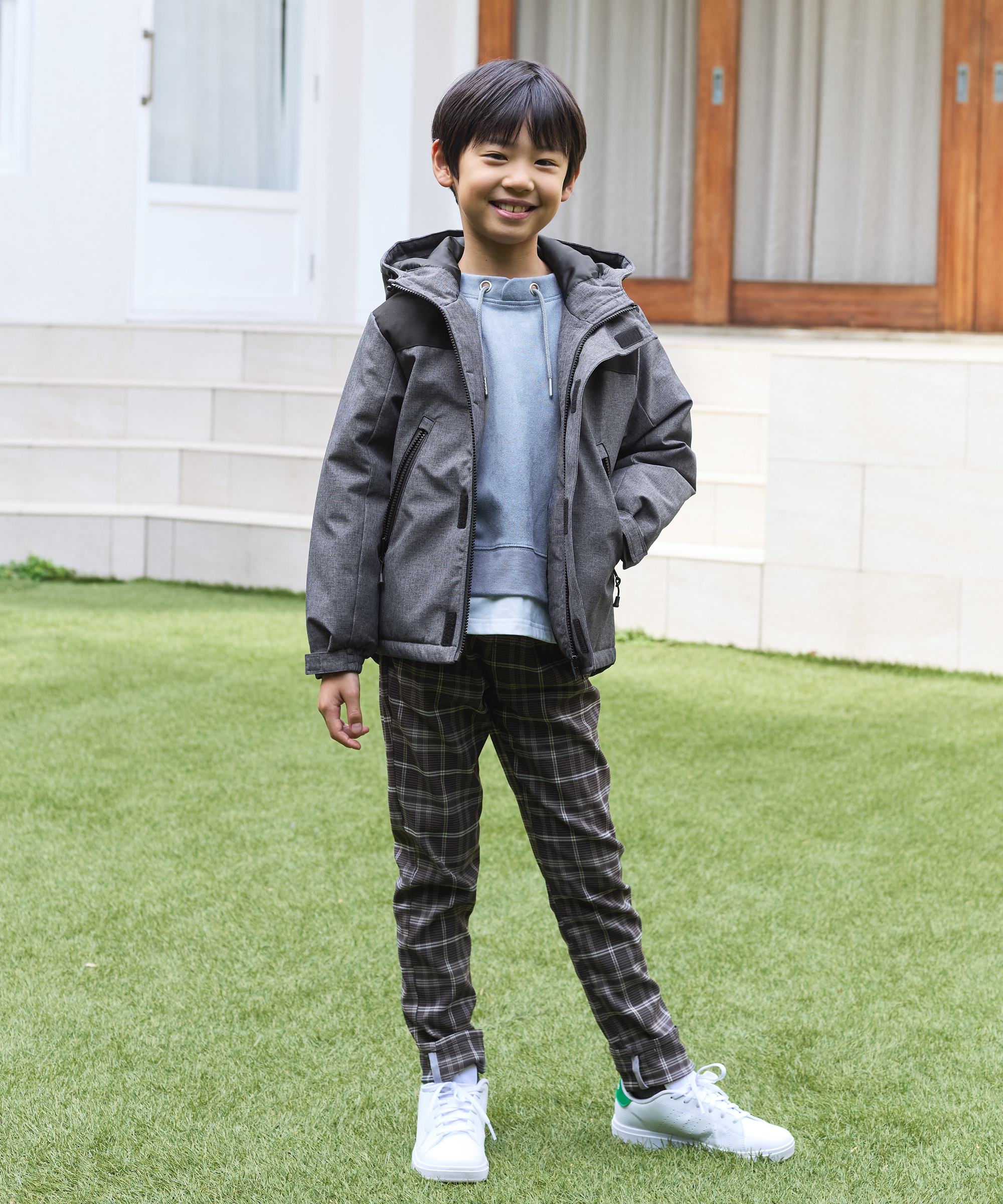 身頃と袖を切り替えたワザありアウターと、異素材×ブロッキングが存在感を放つブロックスシリーズのロンTを主役にしたコーディネート。全体を引き締めるブラックボトムは、親子で ikka 自慢のストレッチパンツ。アクティブな日常に寄り添いながら、着映え感も楽しめる親子リンクスタイルです。