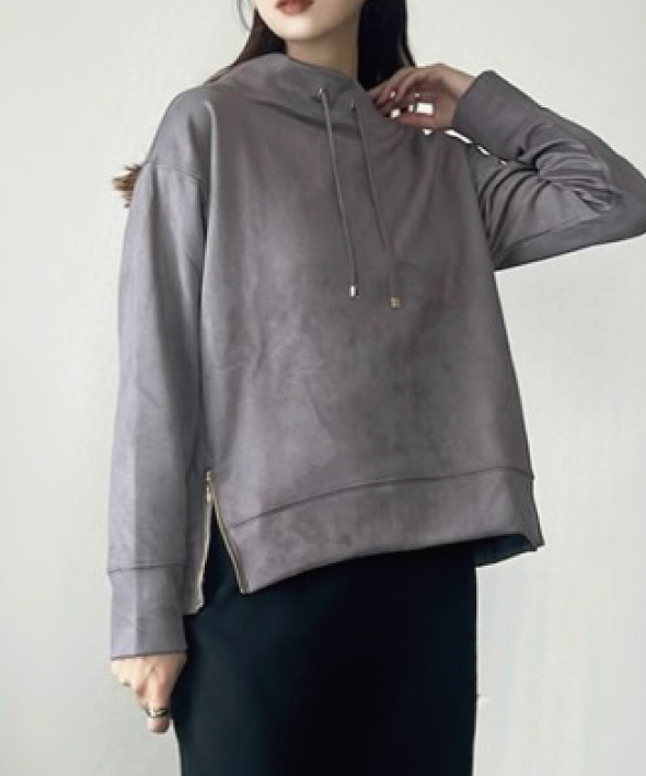 スエード風の微起毛素材が季節感を漂わせるプルオーバー。前後差のあるシルエットや裾にあるファスナー付きスリットにより、体型カバーやアレンジもできる利便性も!首元にきれいに沿ったモックネックはカジュアル過ぎず大人な雰囲気の抜け感を演出できるデザインになっています。
