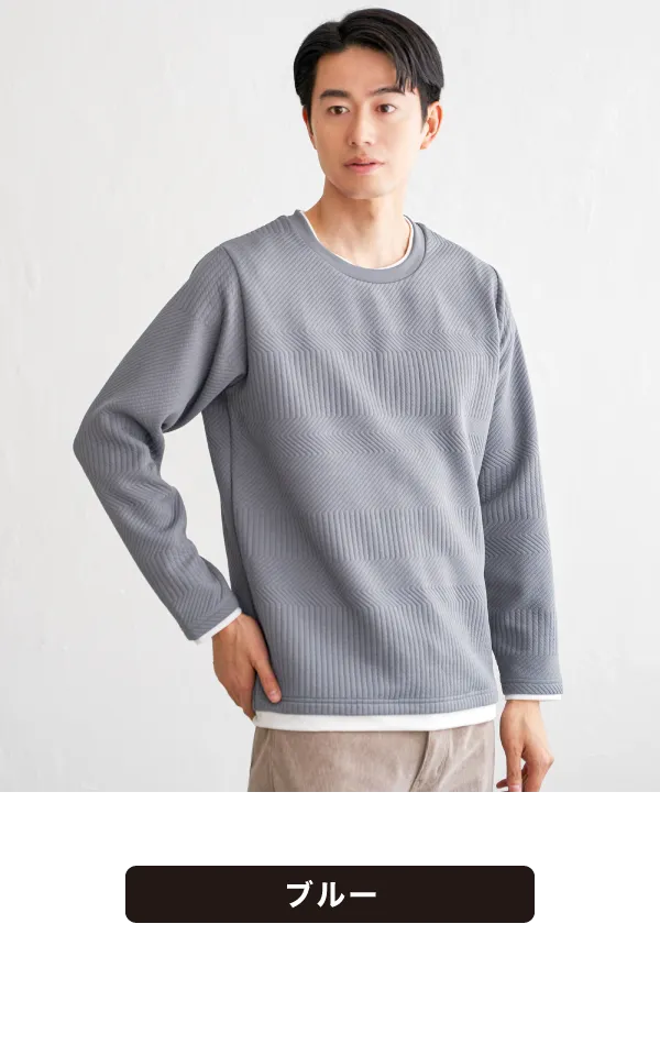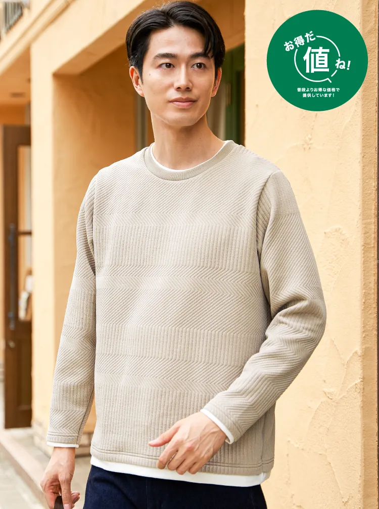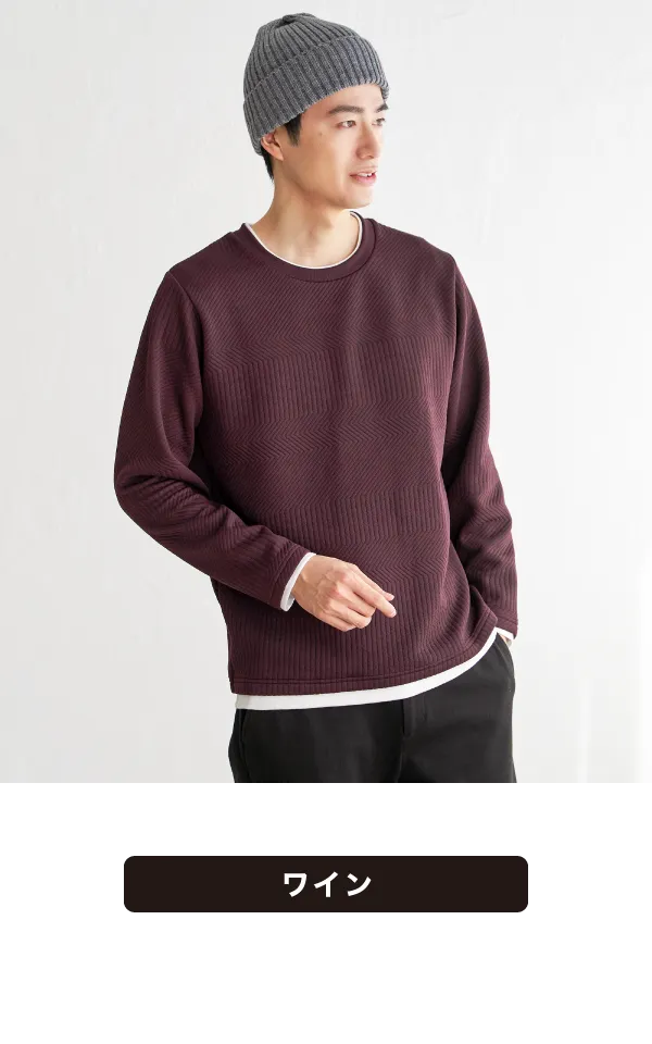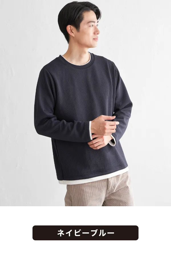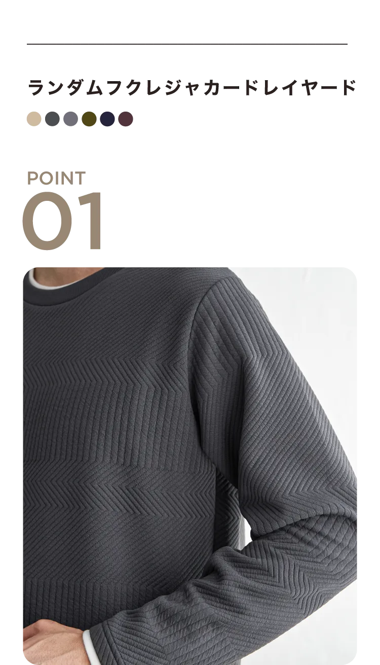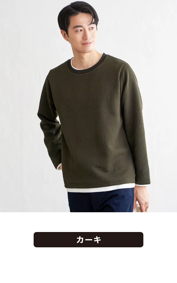 重ね着風のレイヤードデザインで、シンプルな冬コーデでも一気に洒落感アップ。立体的に柄が浮かぶフクレジャカードで、ジャケットやアウターのインナーとしても、単品でも奥行きのある表情に仕上がります。ゴワつきに悩まずサッと決まるから、忙しい大人のデイリー着として頼れる一着です。