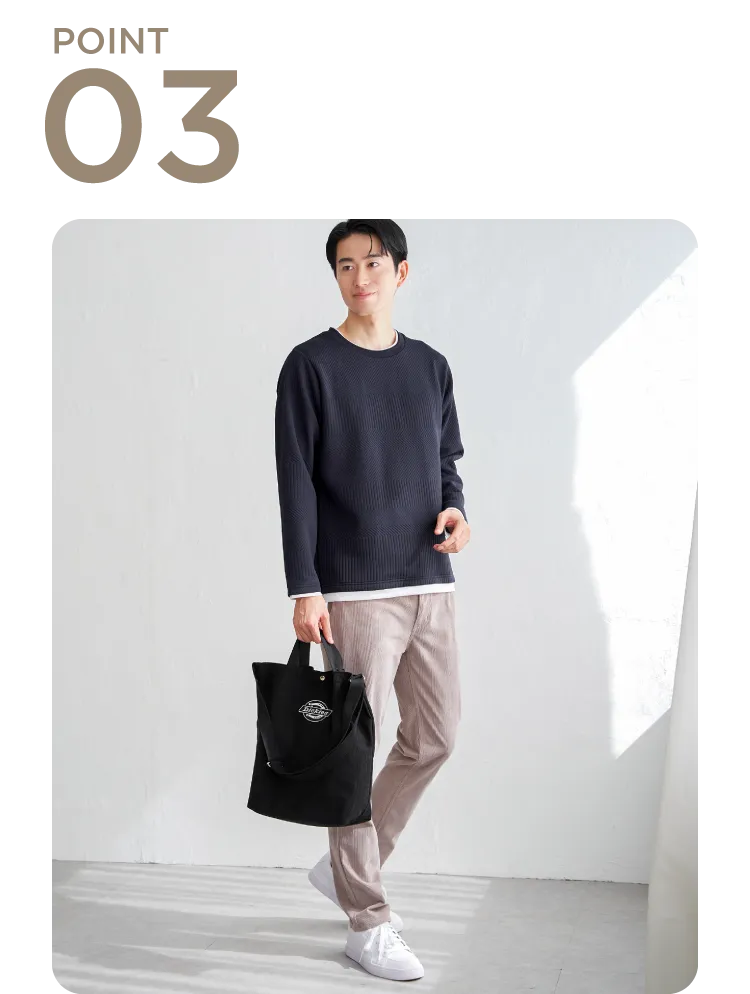 大きすぎず細すぎない程よいサイズ感で、ジャケットやコートの下にも合わせやすい。日常的な着回しに便利です。
