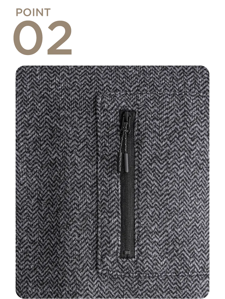 表面にヘリンボン柄プリントが入り、胸のファスナーポケットと合わせて、シンプル以上のアクセントに。デザイン性と機能性の両立が魅力。