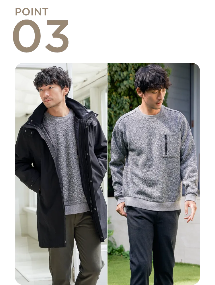着回ししやすい程よいサイズ感で、アウターINでも単品でも収まりが良い。日常的に気軽に使える仕様です。