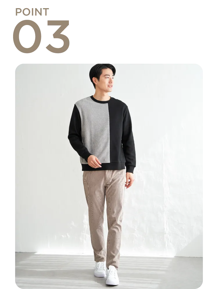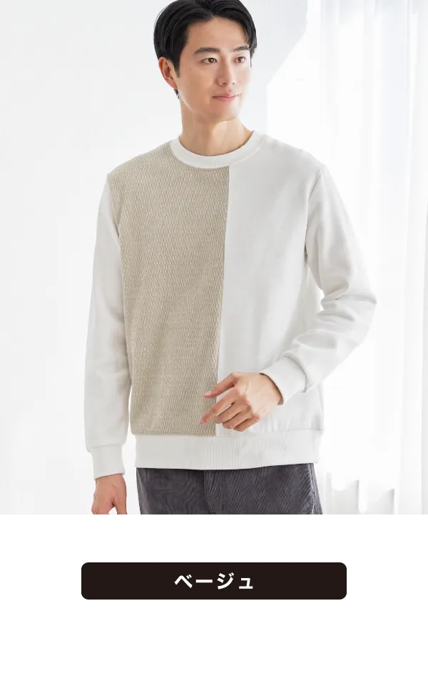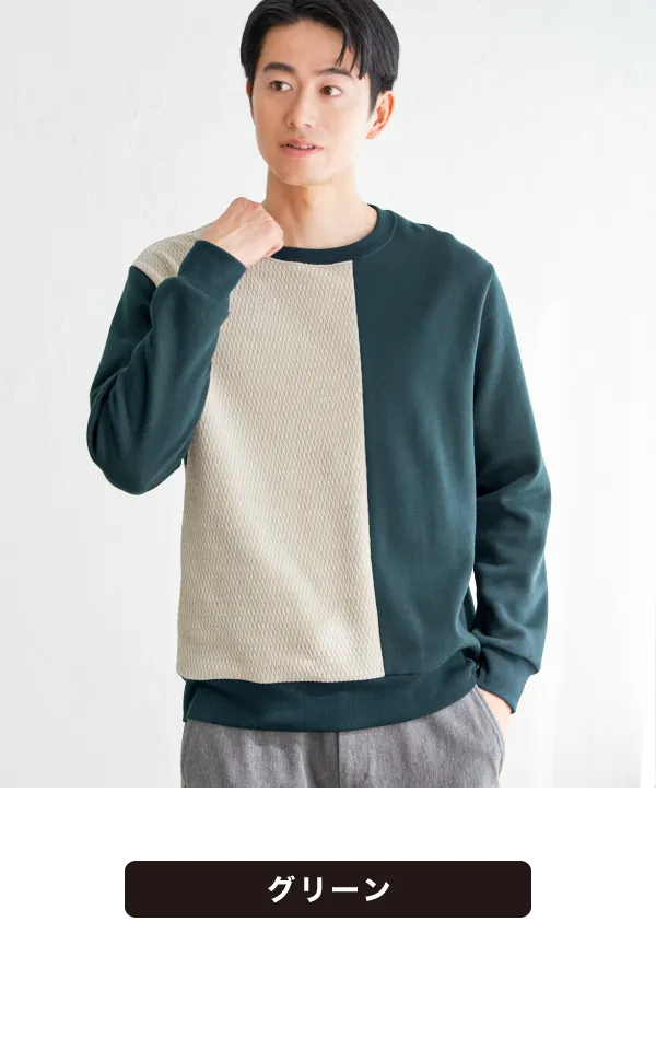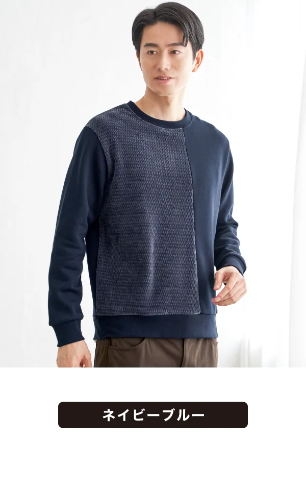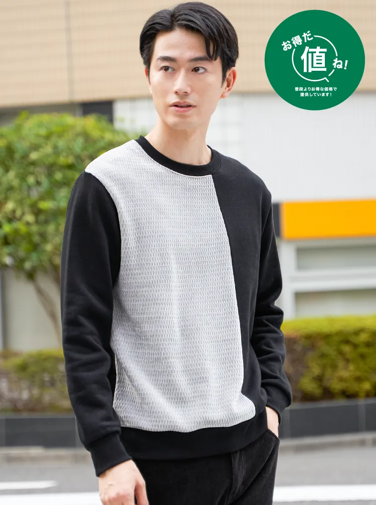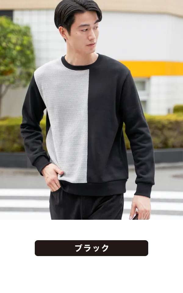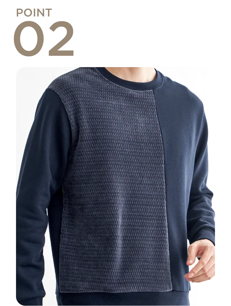 前身頃で異素材を大胆に切り替えた、見た目のインパクト抜群なプルオーバー。モールジャカードの柔らかな凹凸と、裏起毛ポンチの組み合わせが、立体感と季節感を同時に演出します。シンプルなカジュアルでも印象的に仕上がり、コーディネートを格上げしたいときの即戦力です。