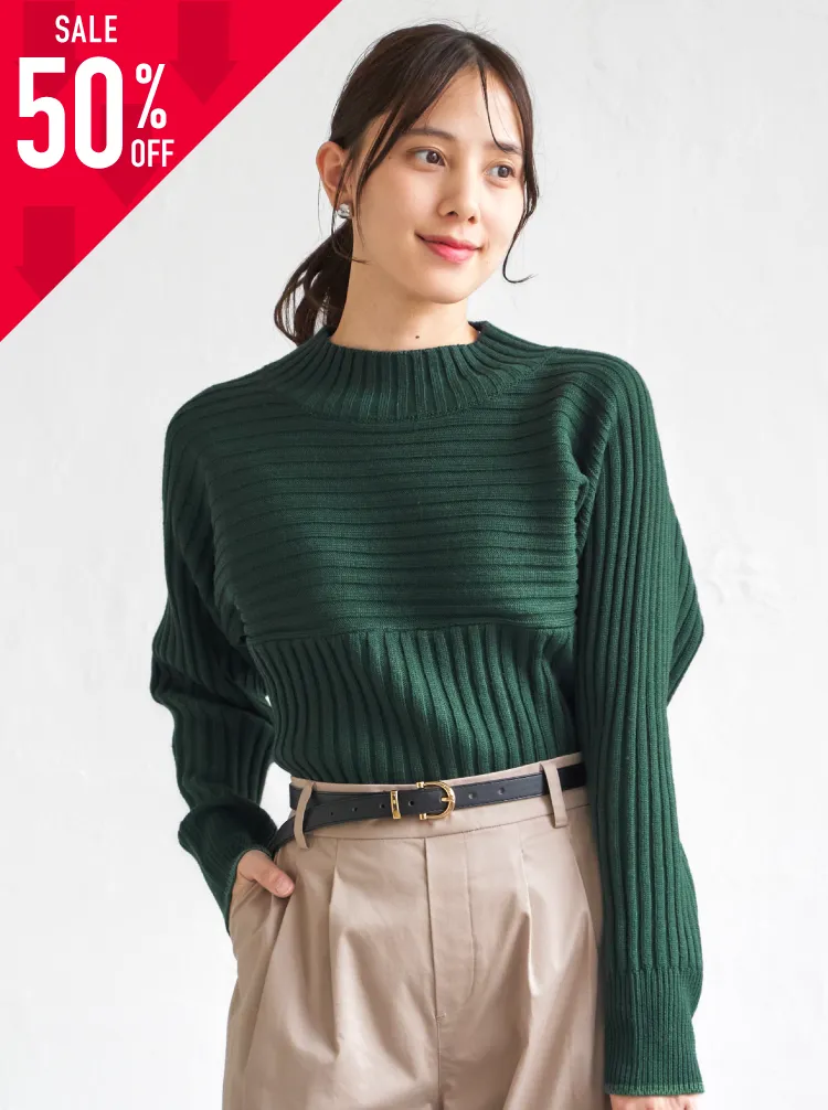 縦横のリブ切り替えが立体感を生み、シンプルでも着映えるデザイン。体に張り付きにくい快適なサイズ感で、自然な細見えも叶えます。微配色ラインが上品なアクセントとなり、デイリーに使いやすいバランスの良いニットです。