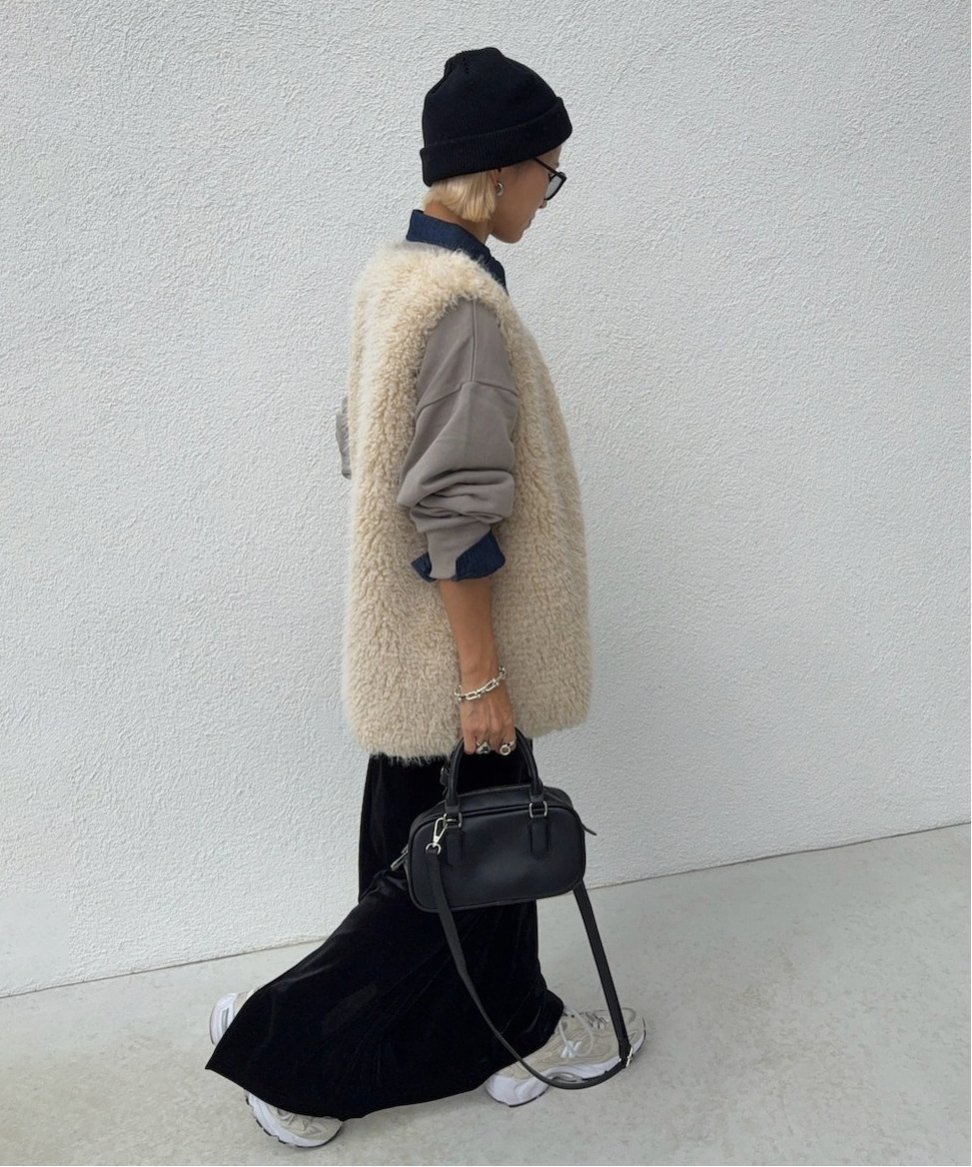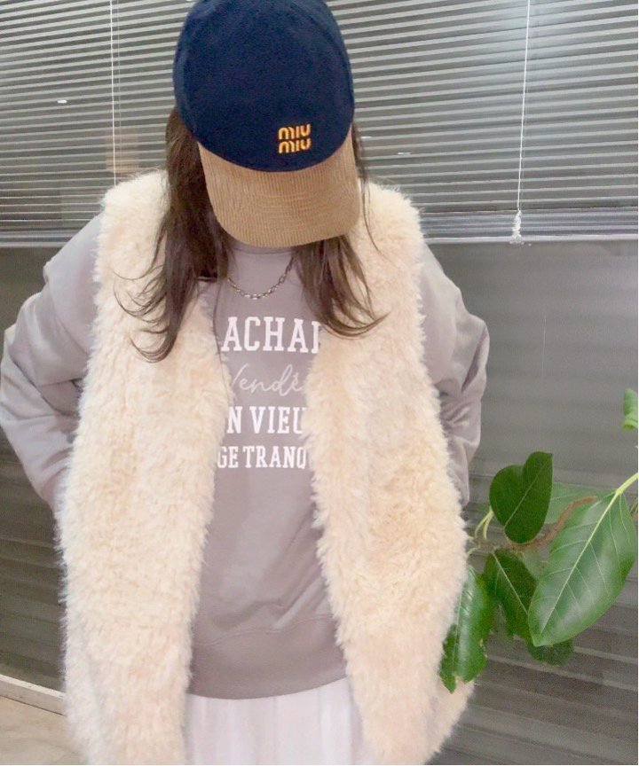 毛足のやや長いフェイクファーが華やかさをプラスする、主役級のロングベスト♡