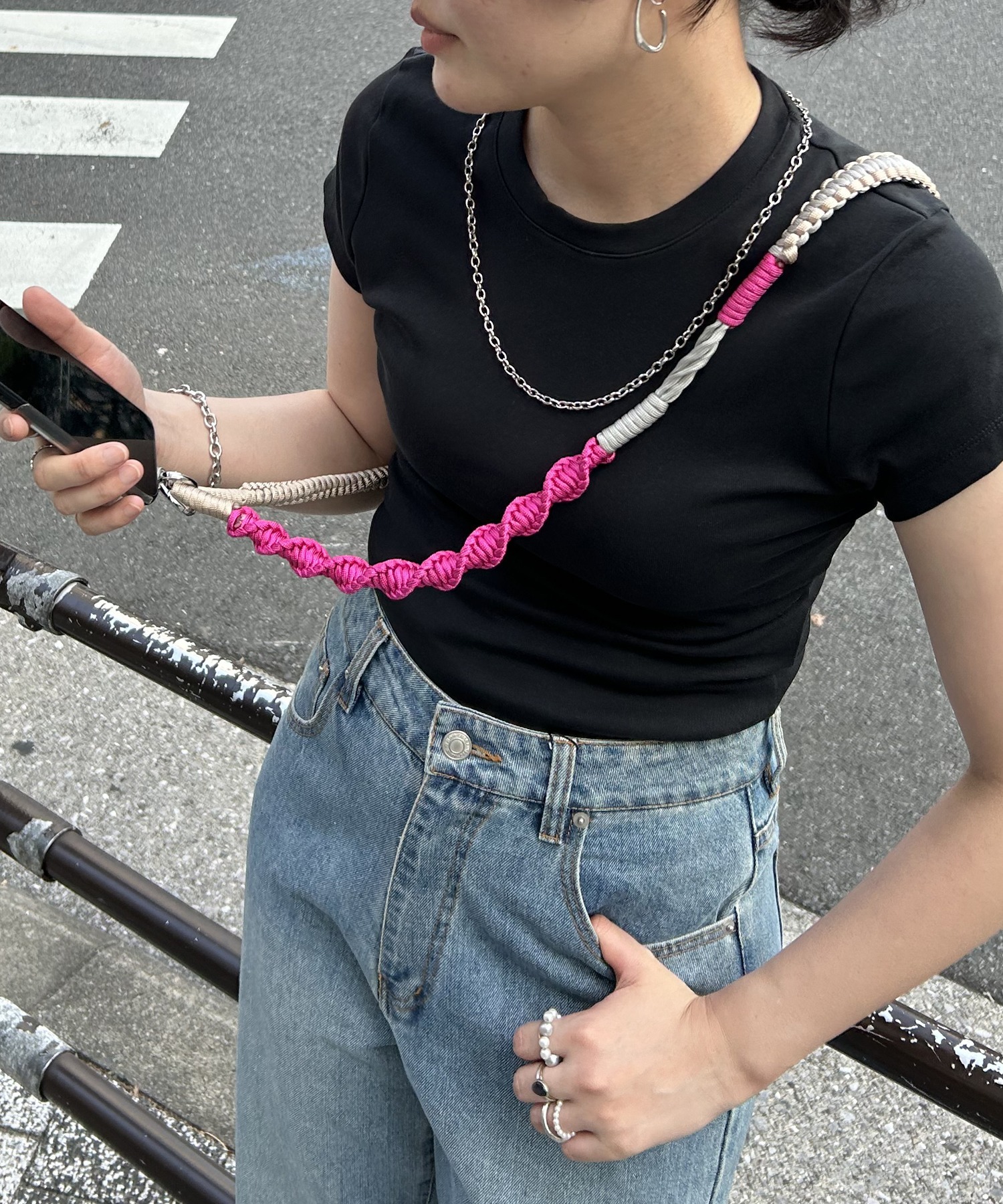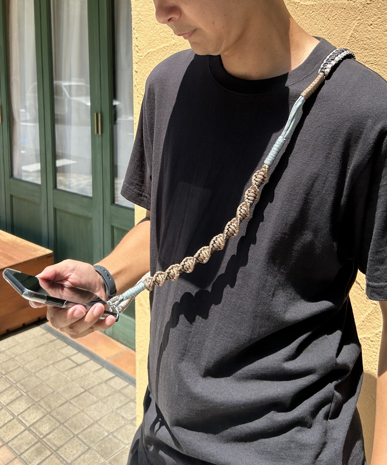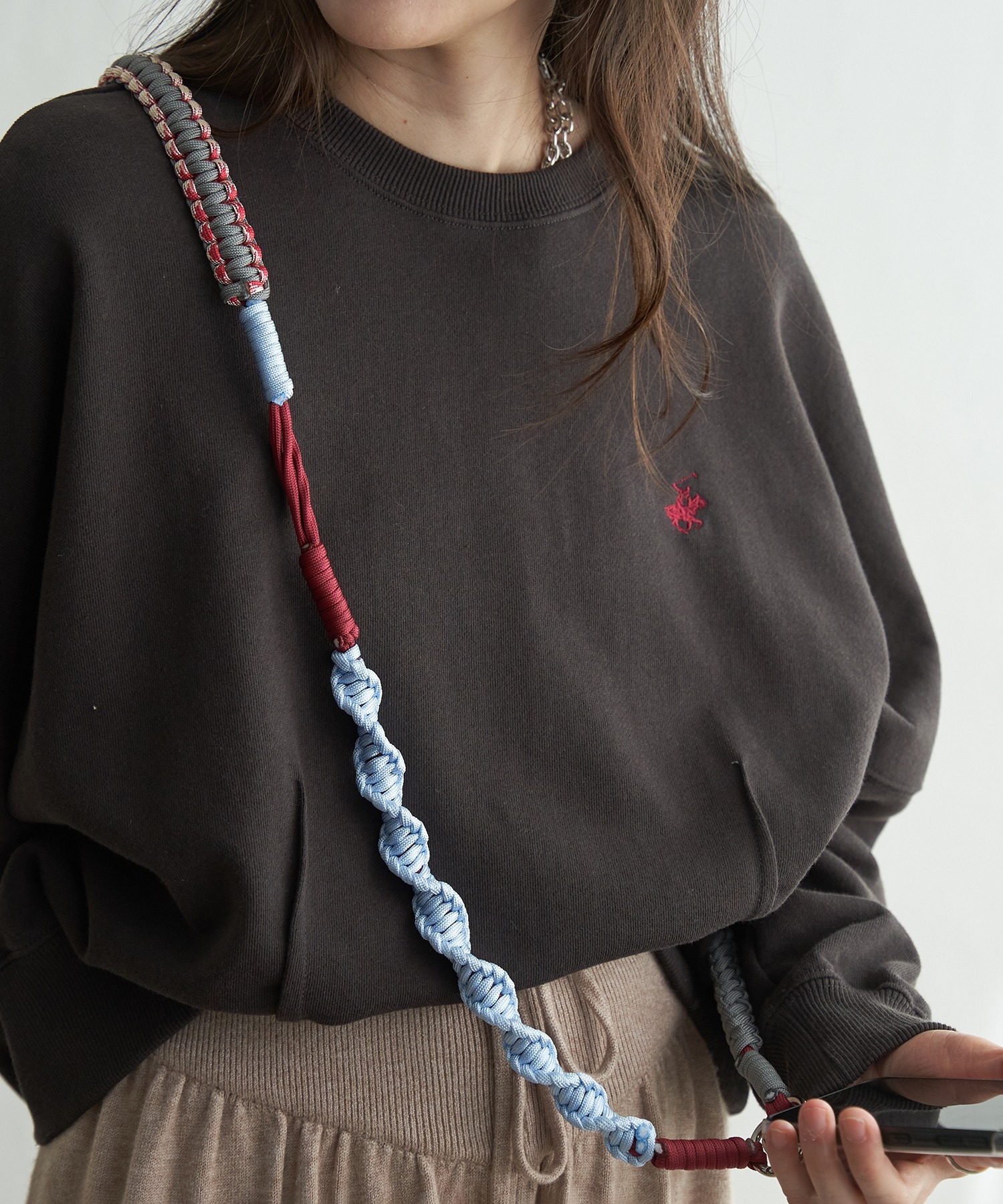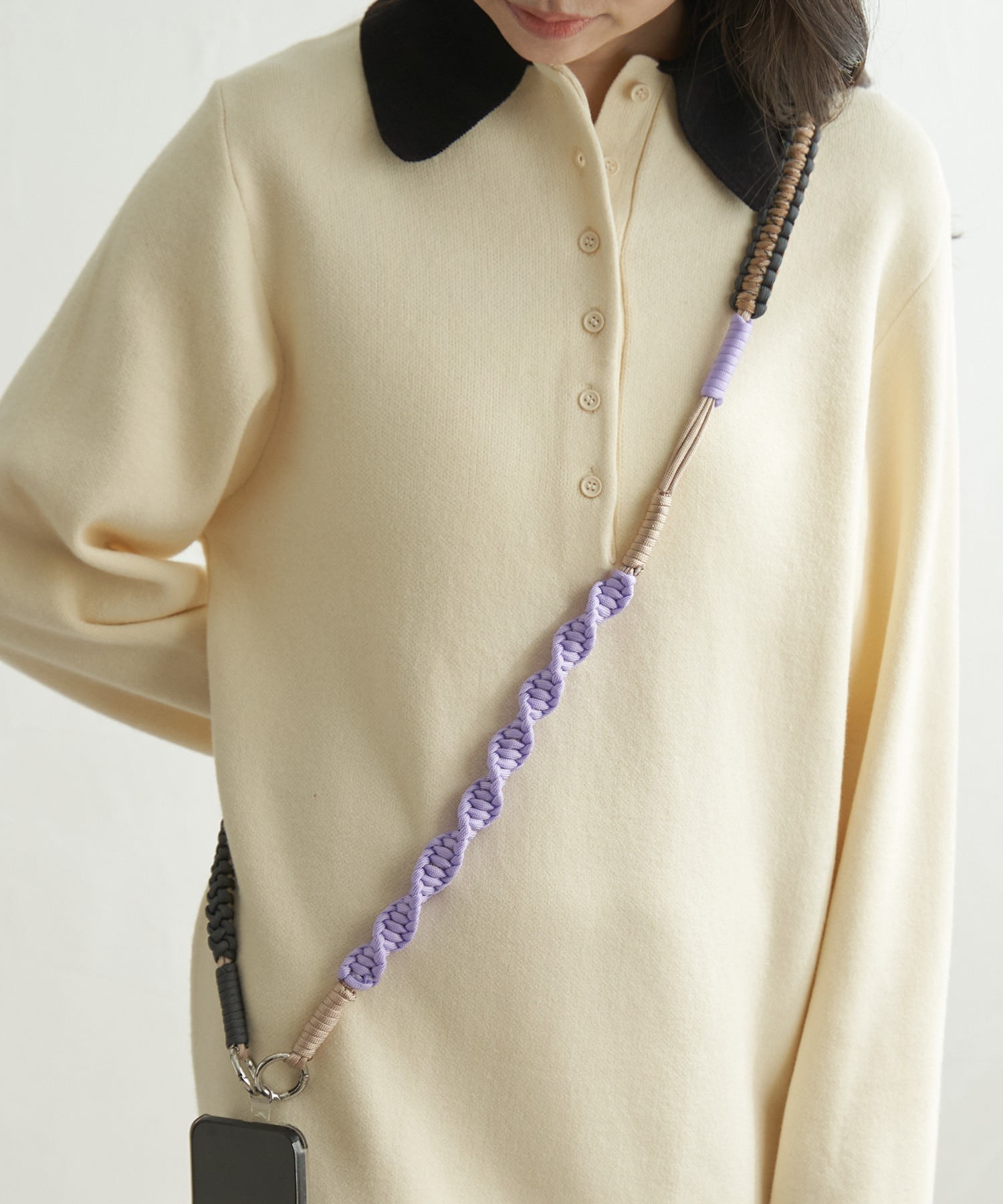 配色デザインのロープを組み合わせた遊び心のあるスマホストラップ。